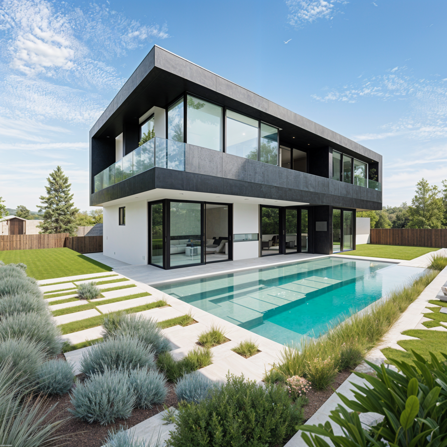 modern exterior shot a modern two story house with large windows and an elegant black and white exterior surrounded by lush green grass and delicate wildflowers a crystal clear turquoise pool reflects the serenity of the blue sky filled with soft fluffy white clouds the natural light creates a relaxing atmosphere let s add some wooden sections to the already white facades the exterior walls are made of smooth concrete what s on the left is the parking ramp not a pool architecture