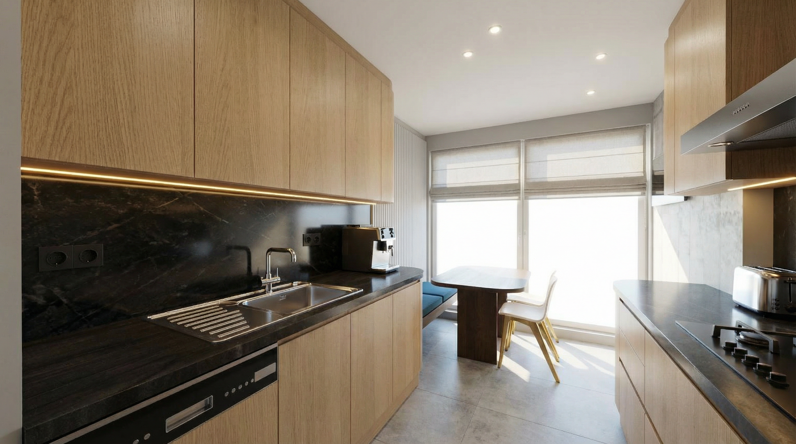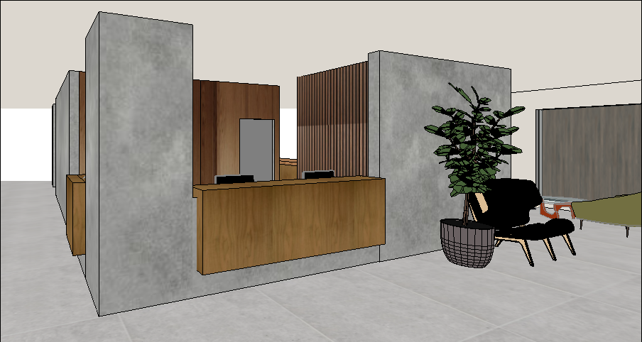 door in back wall to be cladded with wood as well hidden in wall floor tiles a little bit darker grey