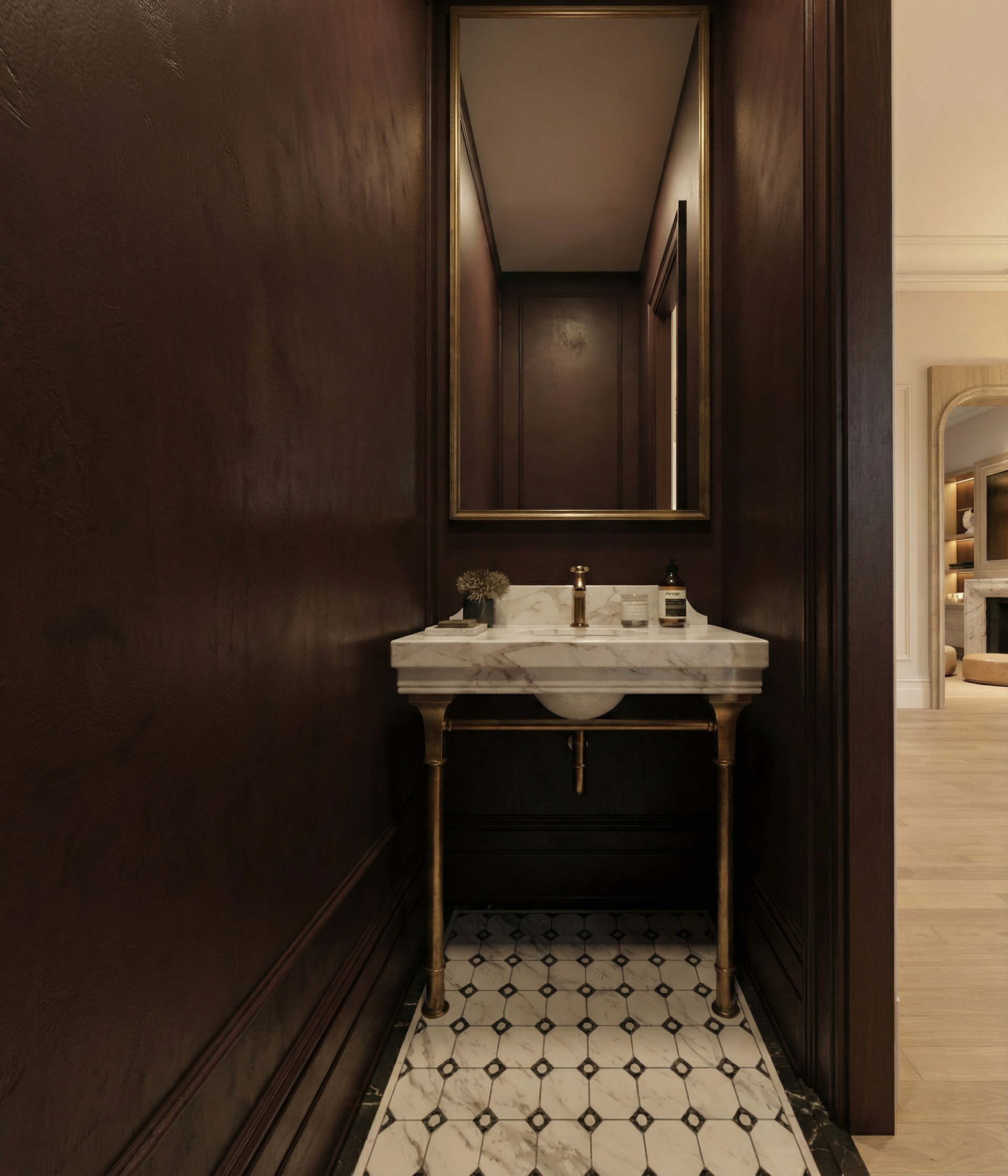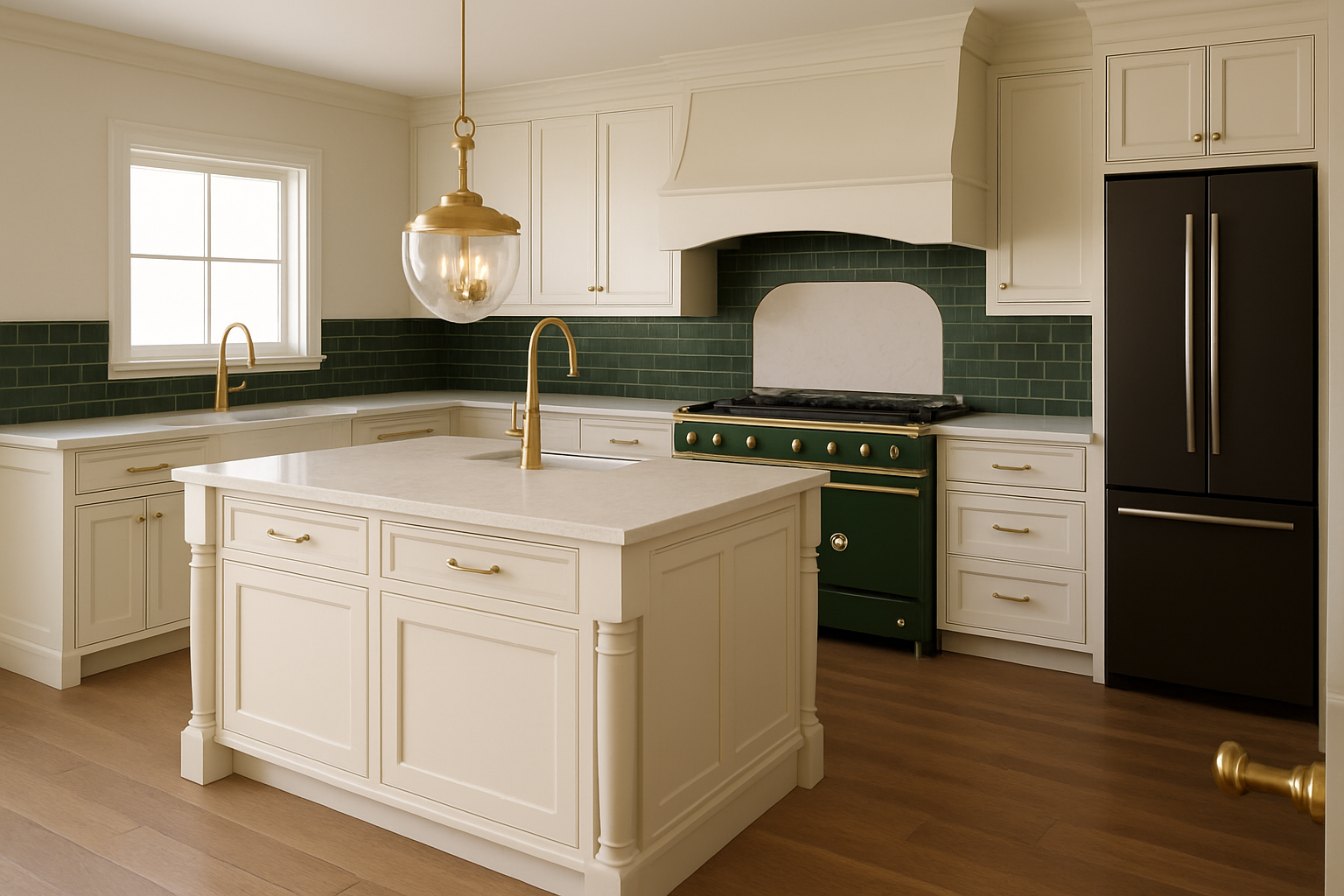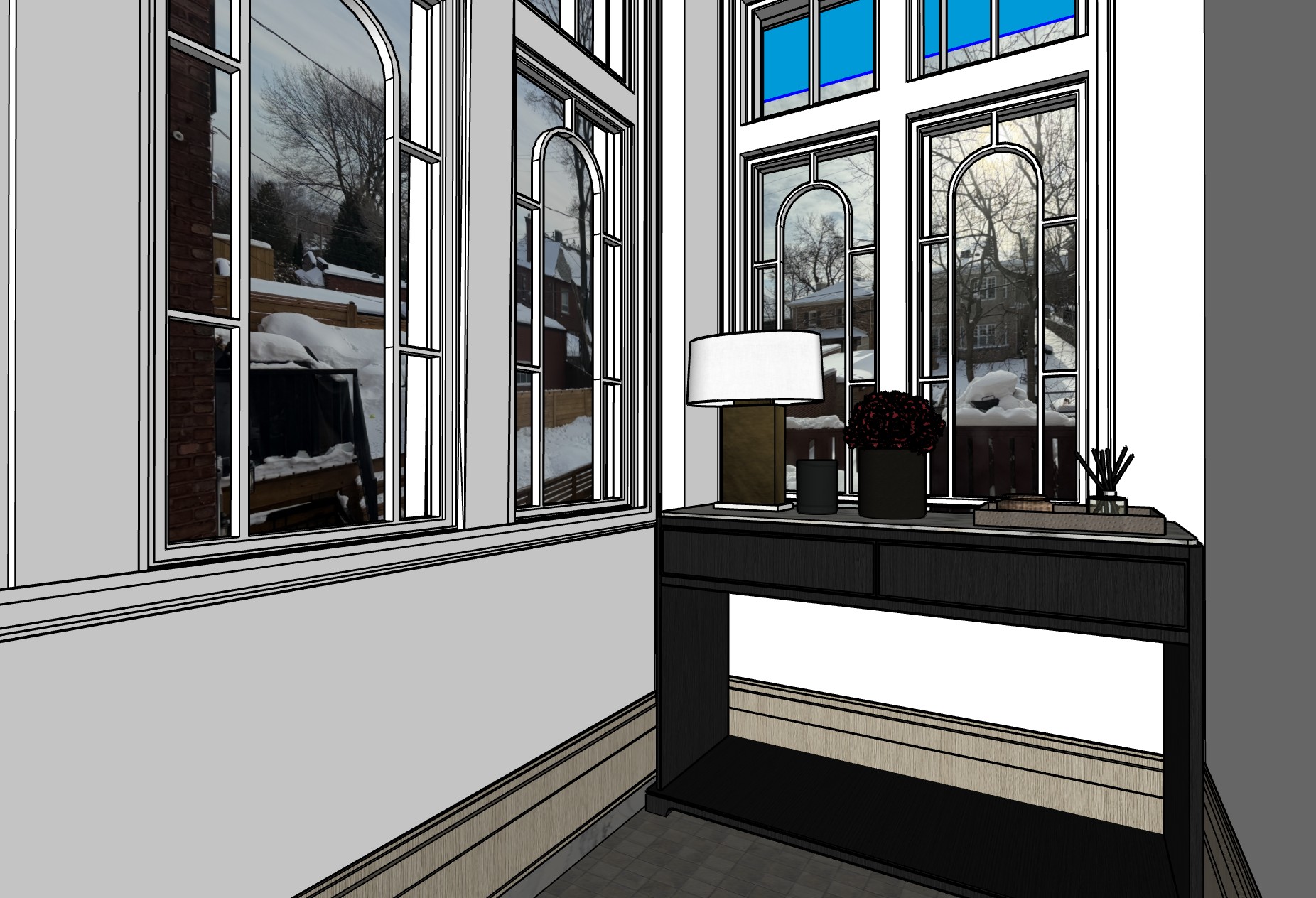 render a serene interior entryway with a vintage charm the front door is a deep navy blue with intricate stained glass panels allowing warm sunlight to cast colorful reflections the walls are painted a soft dove grey creating a calming backdrop adjacent shelving is accented in crisp white with minimalistic matte black decor the cabinetry is a light natural oak paired with sleek black handles for a modern touch large windows are dressed in sheer flowing white curtains gently filtering the light the floor is covered in rich dark wood adding warmth and grounding the space the atmosphere is tranquil and inviting bathed in natural light with a harmonious blend of classic and contemporary elements