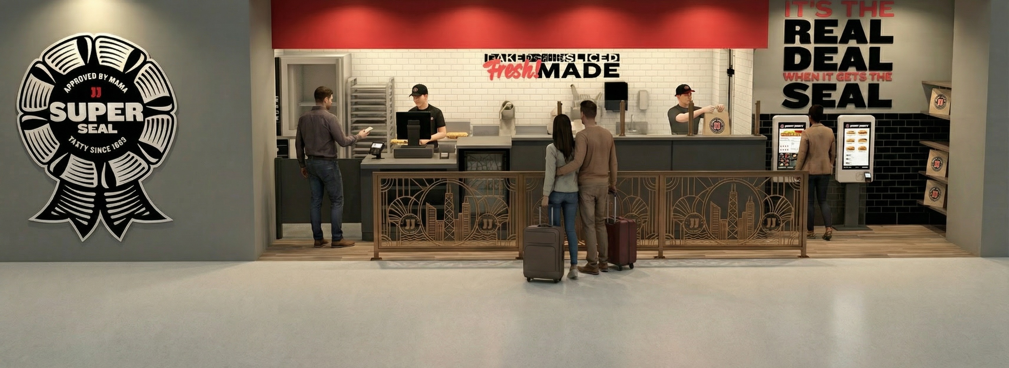 this is a proposed jimmy john s to be located in an airport transform the provided restaurant interior image into a high end photorealistic render with warm lit atmosphere and relaxed upscale energy while keeping everything exactly the same same proportions same equipment same ceiling curves same wall finishes same materials while making them look realistic and same spatial configuration remove the spotlight directly above the black super seal wall graphic there will not be a light directly above this graphic the black super seal graphic will be lit by overhead lights throughout the hallway do all of this while keeping the camera angle existing materials wall signage and other composition exactly the same do not change any of the materials shown in the provided image