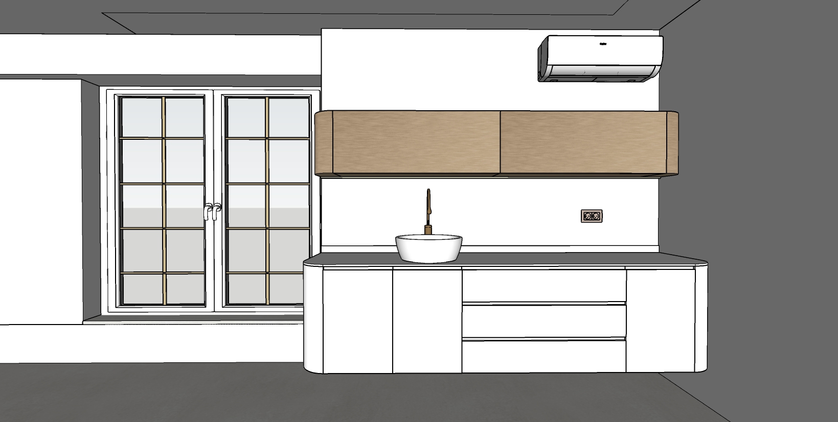 banda led sub corpuri de sus si jos atentie cum bate lumina chiar sub corpuri doar material corpuri suspendate brushed bronze kronospan material corpuri inferioare mdf vopsit mat blat alb pereti varuiti alb geamuri albe poti adauga o planta in stanga