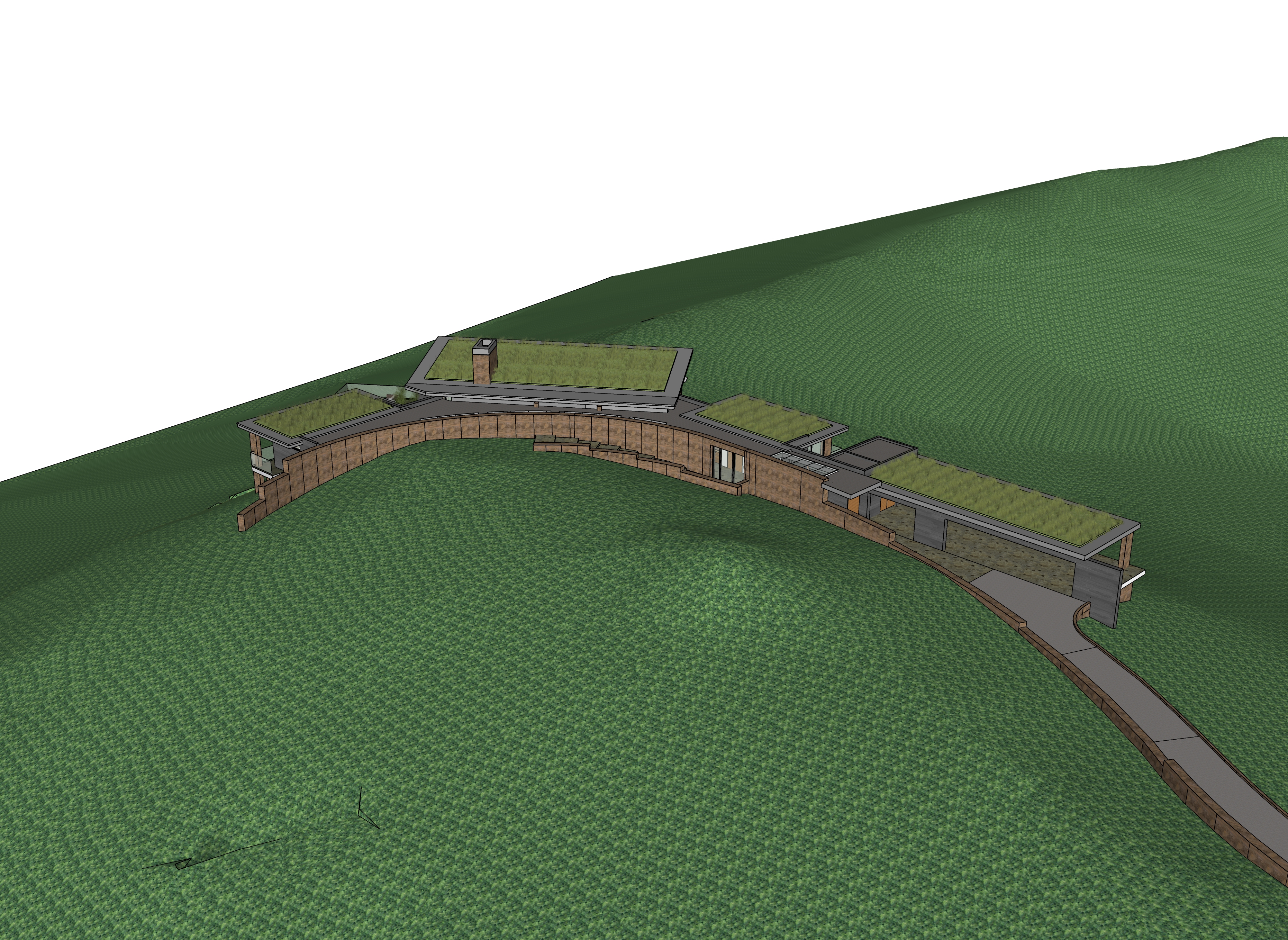 the house is located near pepin wisconsin on top of a bluff overlooking lake pepin towards minnesota add lake pepin to the view in the distance below the area around the house is planted with native prairie grasses the add a few birch trees and maple trees to right and left sides of the driveway leading to the house in foreground of the view the house material is site cast concrete with a natural warm clay color and some weathering on the surfaces add a range rover driving towards the house on the road add a red farmall tractor to the carport