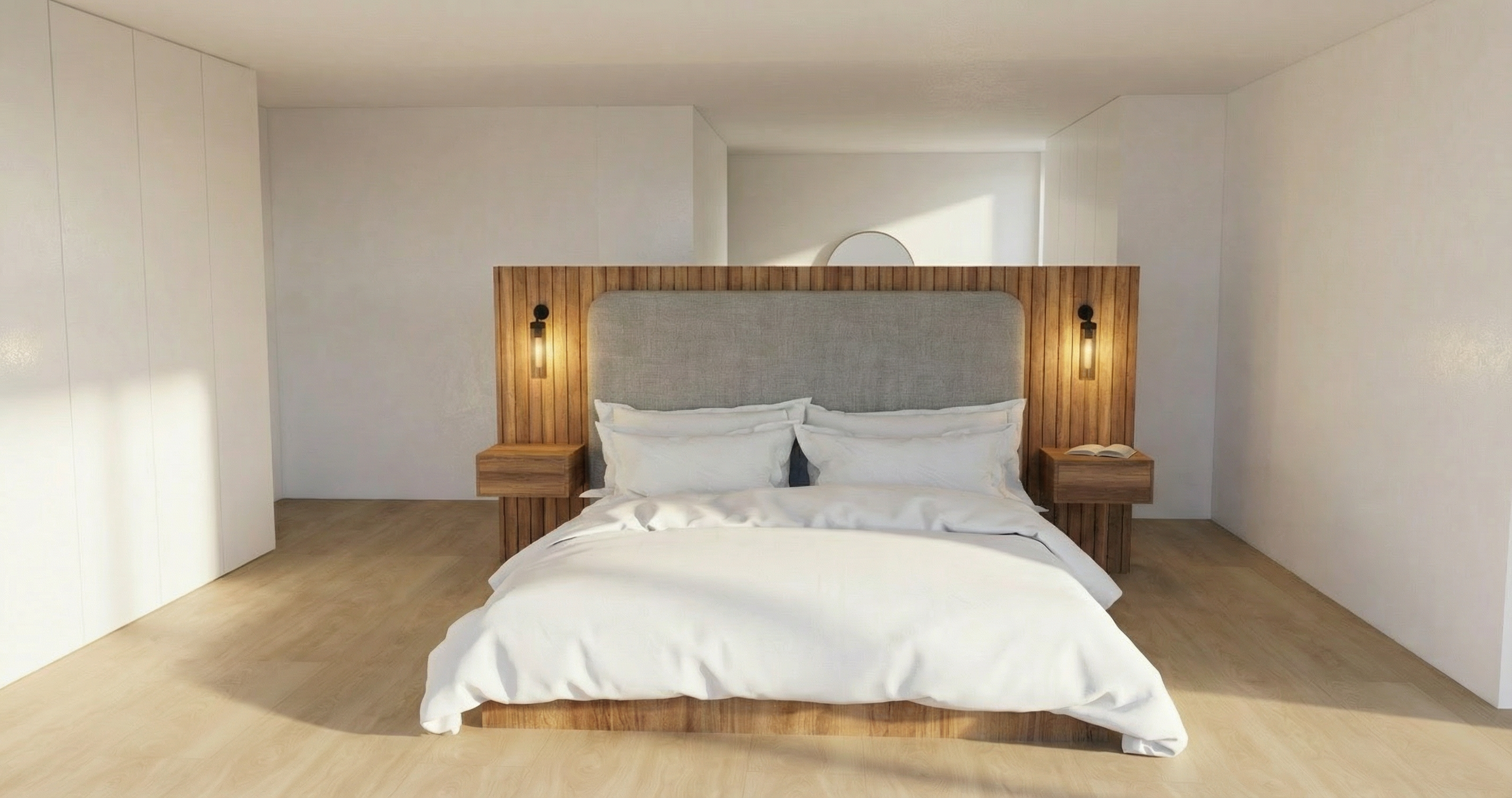modern bathroom 2x2 square cream tile on all walls with matching grout brushed nickel plumbing fixtures cabinetry is ash in a natural stain countertop is a warm beige gray stone mirror recessed into the wall with wood ledge toilet is white tankless floor mount with open shelf and cabinetry above curbless shower with fglass door 12x14 niche in corner