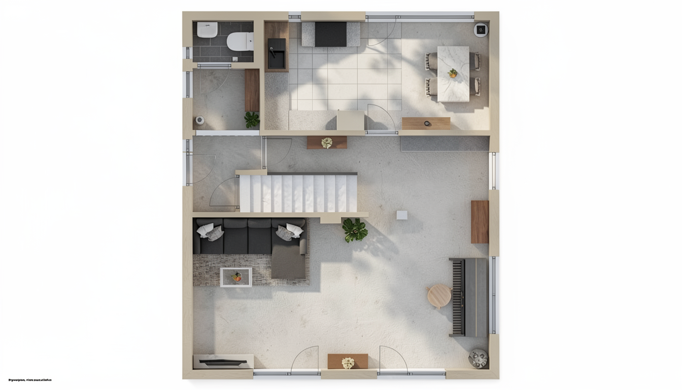 no modificar proporciones geometria ni elementos existentes en la imagen genera un salon hiperrealista para render arqutiectonico 8k a adir cortinas traslucidas en las ventanas sofa color claro beige cambiar wallpaper por papel pintado en tonos marrones elegante y sofisticado alfombras color crema de pelo corto luz de d a atmosfera serena