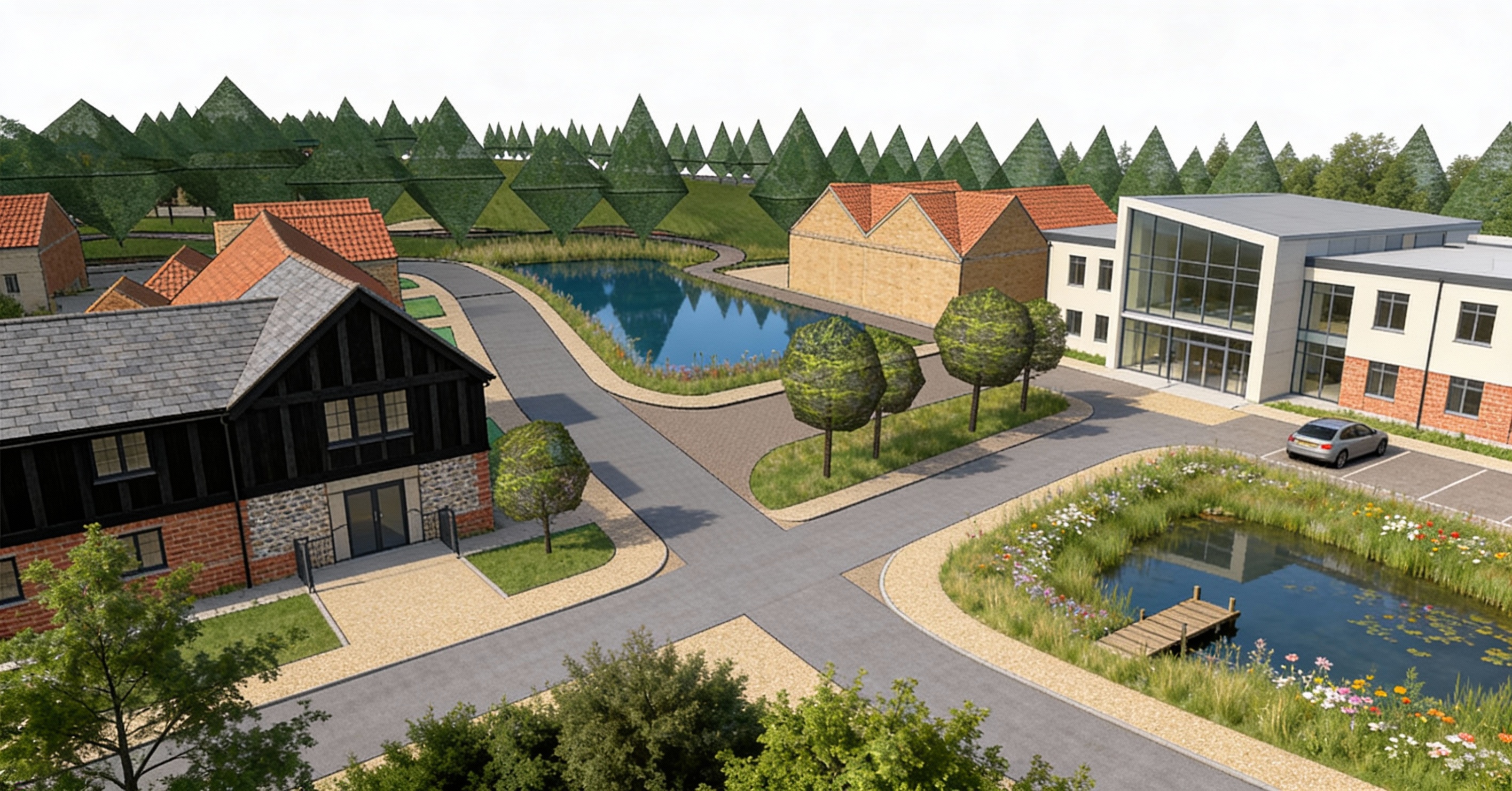 rear elevation of a charming traditional house under a clear blue sky the house features soft light blue walls with white trim around the windows and roof edges creating a classic and inviting look the roof is a slightly darker shade of grey metal adding contrast and depth to the structure a small cozy porch with light wooden accents provides a welcoming entrance the left section of the house is subtly lit by the warm glow of the setting sun casting gentle shadows that emphasize the architectural details the background is a serene open space with a soft gradient enhancing the peaceful and tranquil atmosphere of the scene add driveway from two garage doors add an in ground pool with terrace around it off of the screened porch