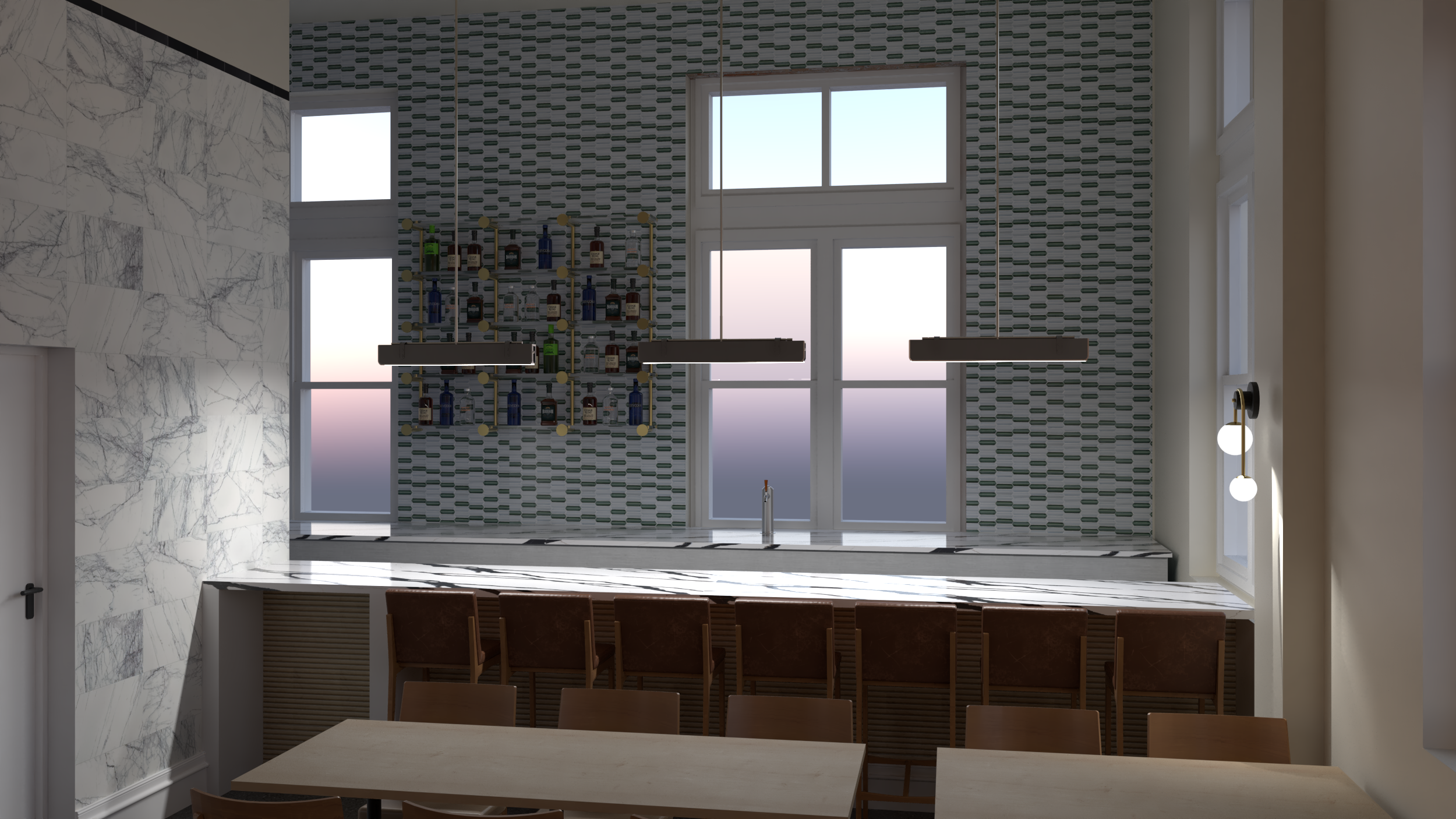 keep everything in the render as it appears but make it a nighttime scene with two bartenders working behind the bar and three people sitting in the bar stools there should not be any recessed lighting and all lighting should be as it appears in the render