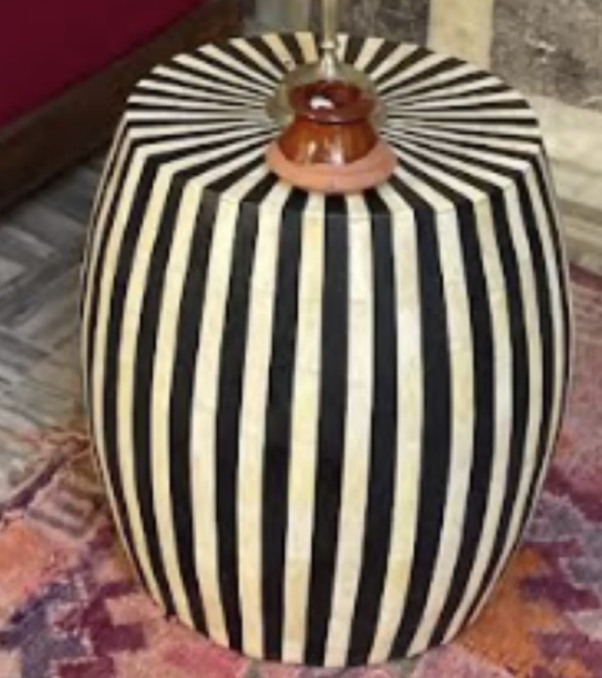 create a 3d model of a small decorative side table for sketchup skp format the table has a rounded slightly barrel shaped body with smooth vertical sides that curve subtly inward toward the top and bottom the surface design consists of evenly spaced vertical stripes alternating between black and ivory cream similar to a drum or circus inspired pattern the top features a small circular wooden accent in warm reddish brown tones centered like a knob or inlay use realistic pbr materials polished resin or lacquer for the striped body natural wood for the accent model should be suitable for interior visualization use in sketchup at approximately 45 cm high and 40 cm wide render the geometry cleanly with quad topology and export in sketchup format