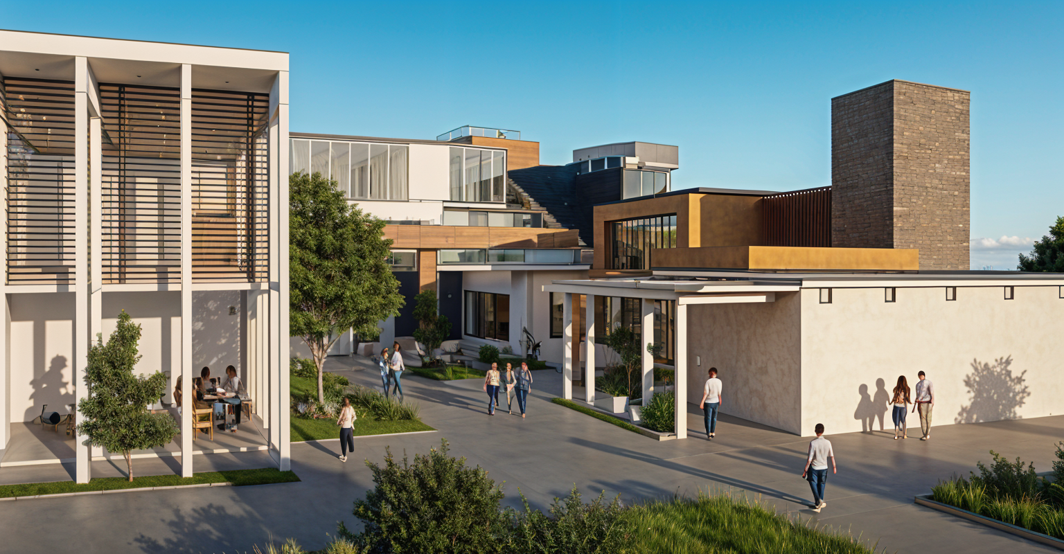 bobby mcalpine exterior shot make this a sport center render located inside a campus in china make the concept simple woody yet aesthetic with nature make it look like a sport public space with people make it look like evening and dont use all wood combine with different colour pallete make the room look like a pilates room architecture