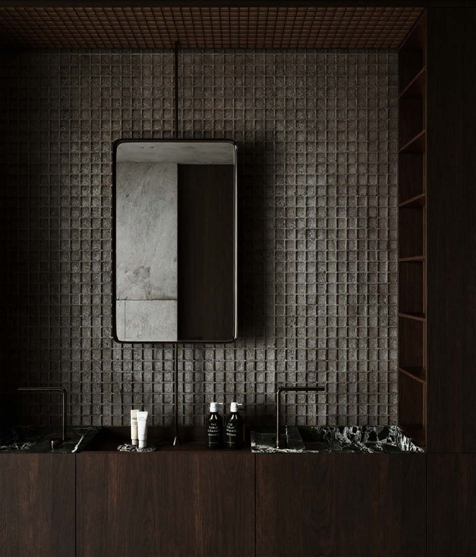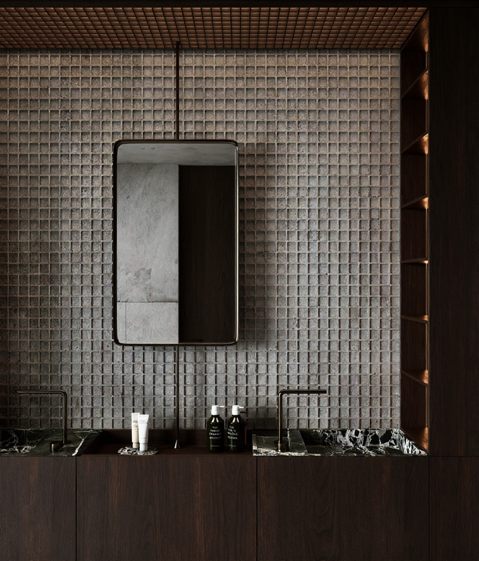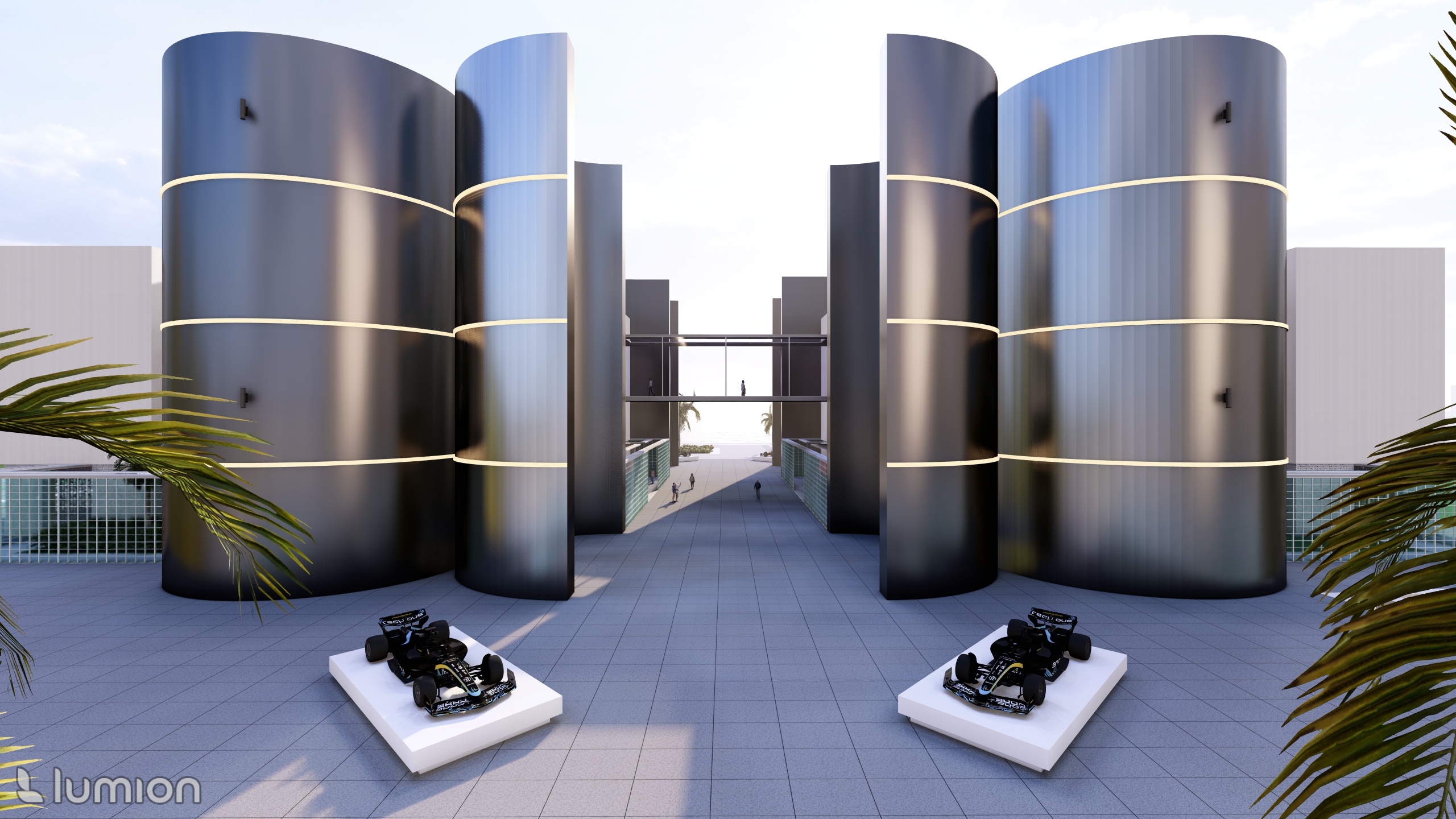 render this scene at night with a luxurious futuristic ambience keep the same building shapes colours landscaping and perspective add soft neon lighting bands wrapping around the curved metallic towers cool white or soft blue illuminate the pathway with recessed ground leds add tasteful spotlights highlighting each palm tree and small accent lights on planters reflections on metallic surfaces should glow subtly the water in the foreground should reflect cool blue lighting and moonlight atmosphere should be clean crisp and high end