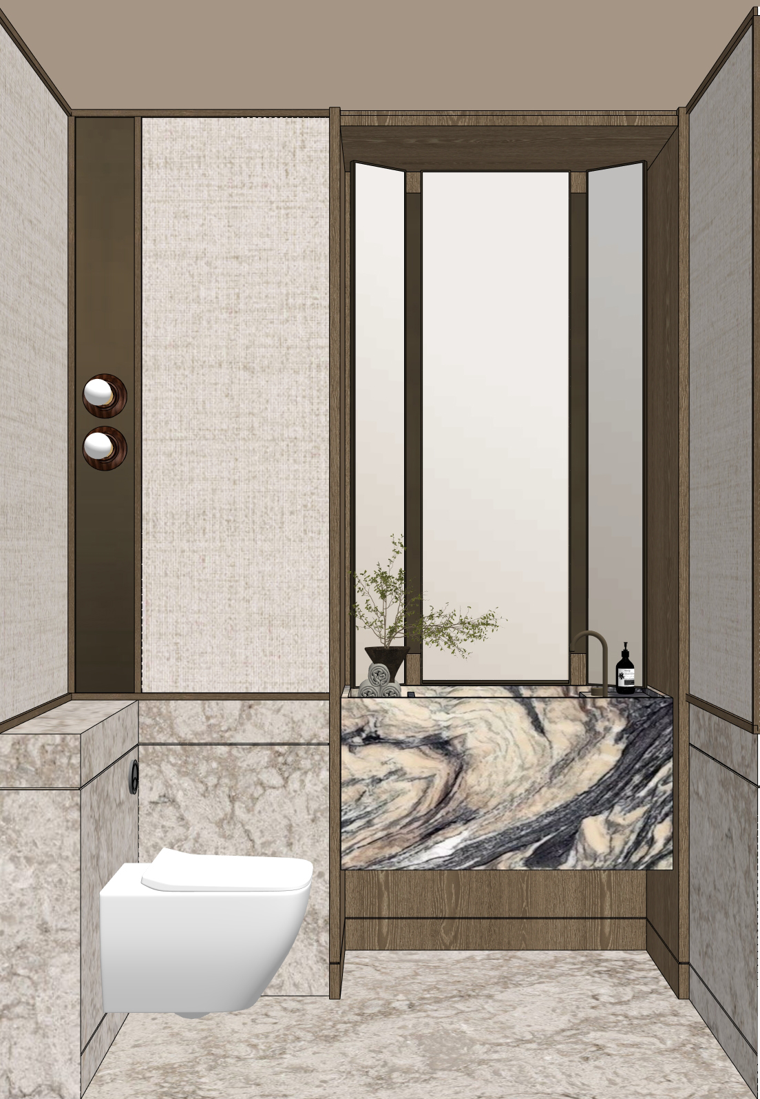 bathroom interior interior lighting temperature 3000k no natural lighting moody ambient bronze metal trims bronze faucet honed finish marble textures