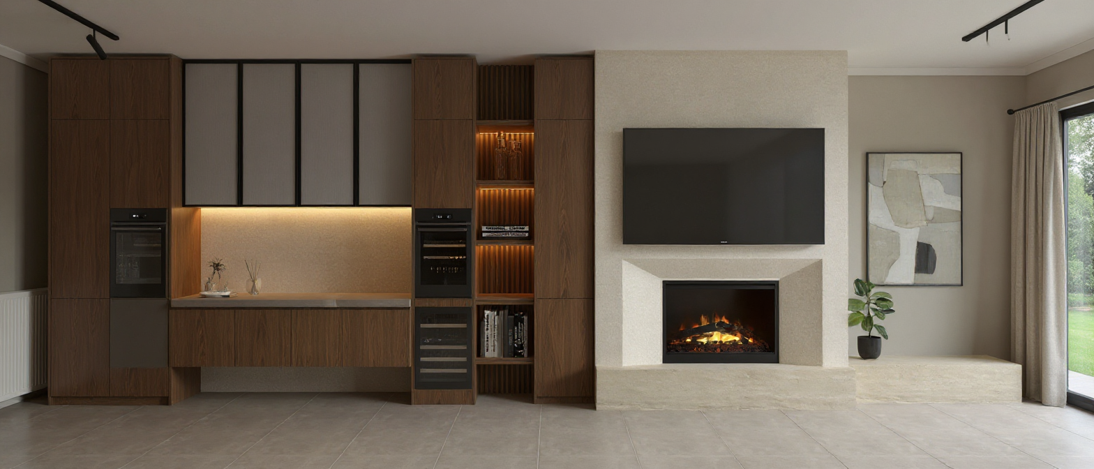a modern luxurious fireplace living room with a serene and sophisticated atmosphere the room features sleek beige oak cabinetry with open color wooden veneer cabinets and a large fireplce centerpiece made natural traavertine pure beige limewash to the walls complementing the cabinetry appliances are seamlessly integrated adding a touch of contrast overhead lighting is warm and ambient creating a cozy yet refined ambiance the flooring beige tiles and cannot change enhancing the airy feel of the space sparse greenery adds a hint of freshness while maintaining the minimalistic and clean design outdoor light from the right hand side window view is of luxury villa style ribbed gloosy glass in the black framed cupboards