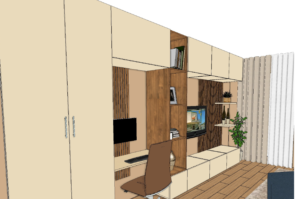 tcabinet back wall consists of wooden slats and put spot light above the monitor