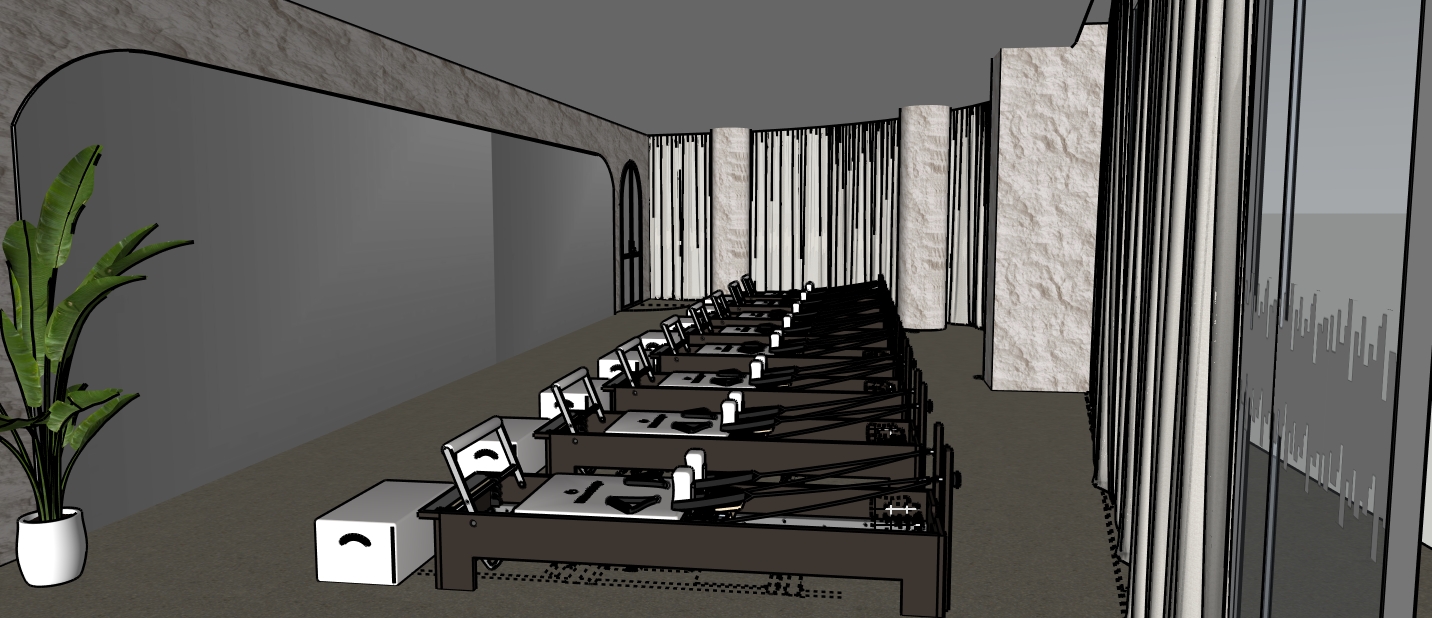 luxury reformer pilates studio 3d wall texture soft linen sheer curtains concealed lighting in ceiling pelmet soft shadows diffused lighting around mirror photorealistic