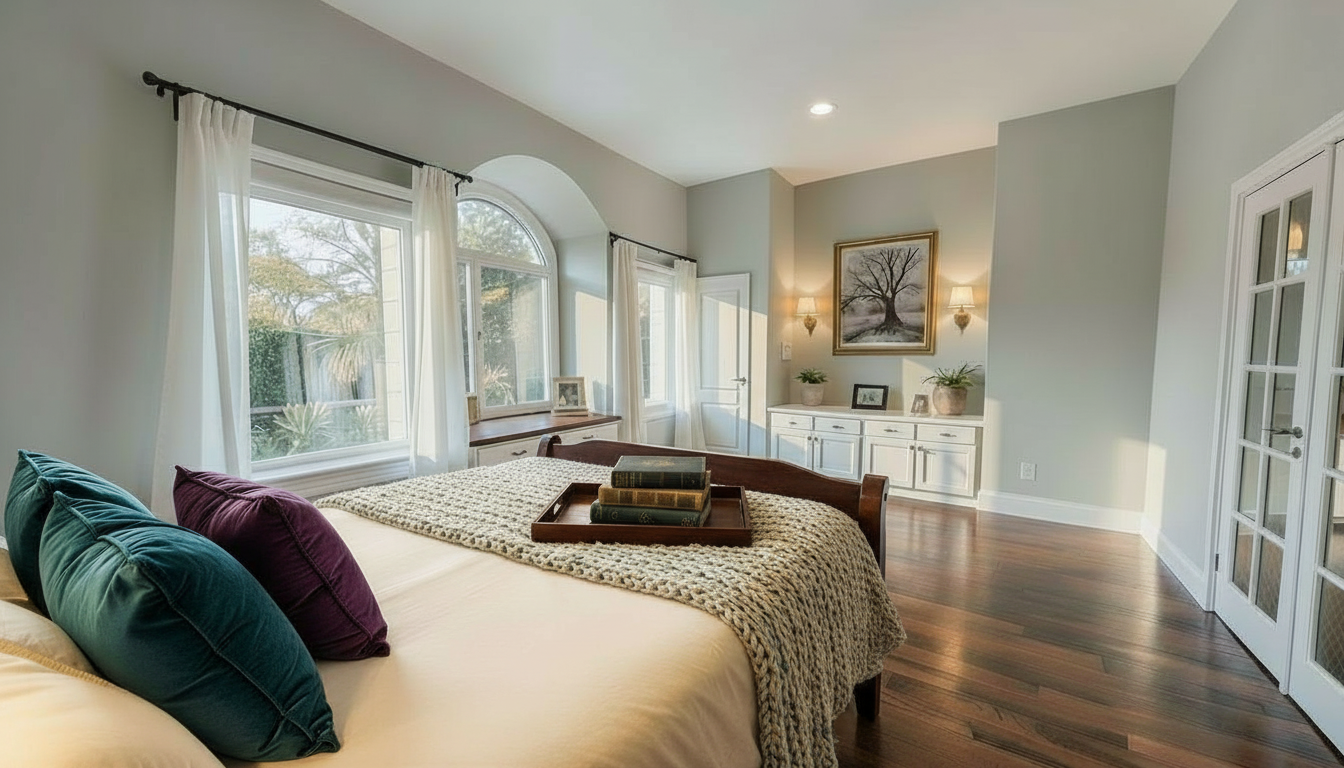 do not remove or change any geometry in image rough hewn tennessee fieldstone stained straight grain white oak tongue and groove ceiling dark metal window frames cold rolled steel beams steel wall panels around kitchen range wall soapstone countertops and backsplash at range wall and shelving beyond dark stained walnut wall paneling above range dark stained walnut cabinetry above cabinets light coming from linear pendant above island smooth finished stucco walls sparse native plants outside afternoon light with shafts of light coming from windows on left side of kitchen add square can lights to ceiling no hardscape visible through windows