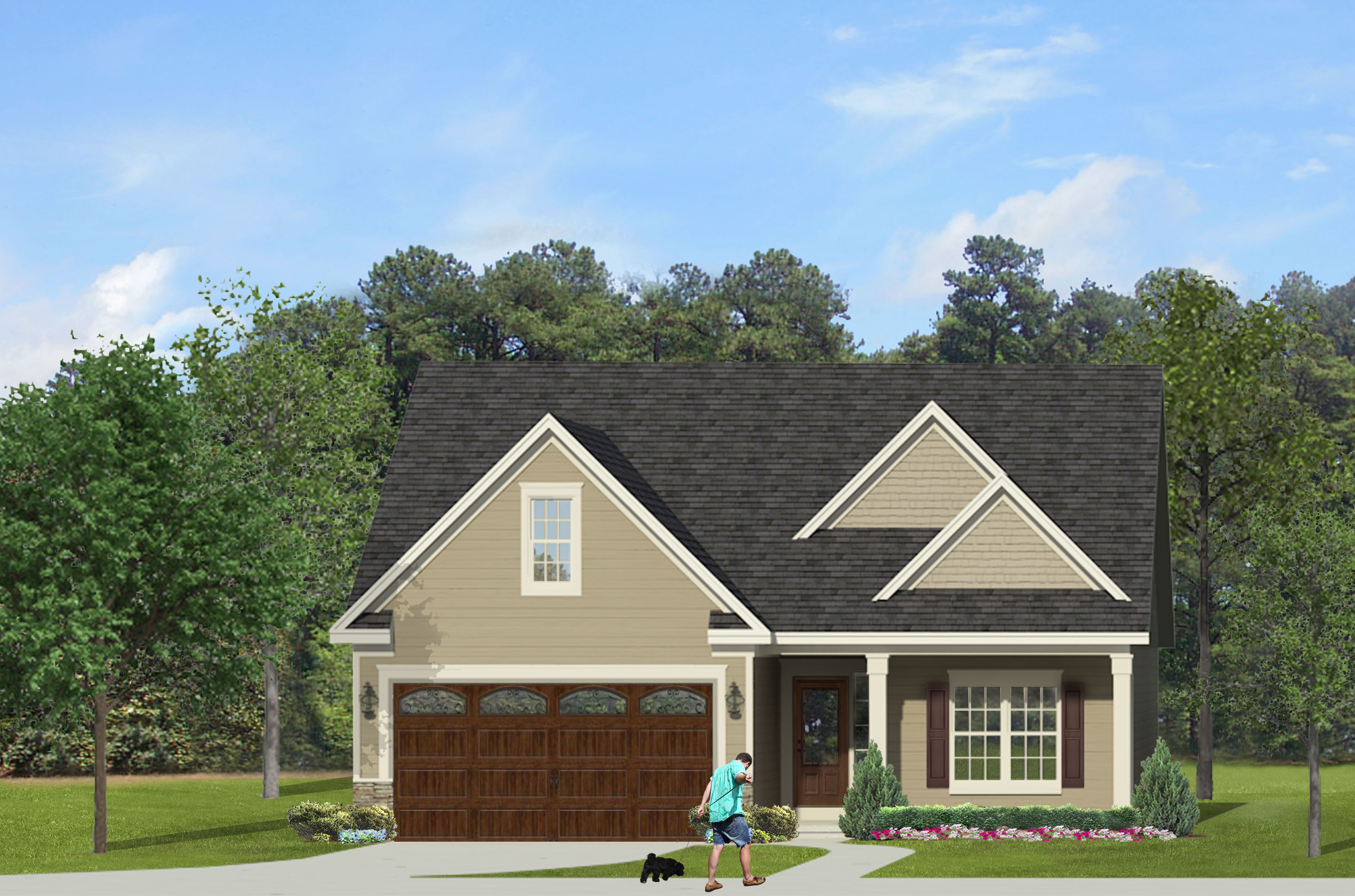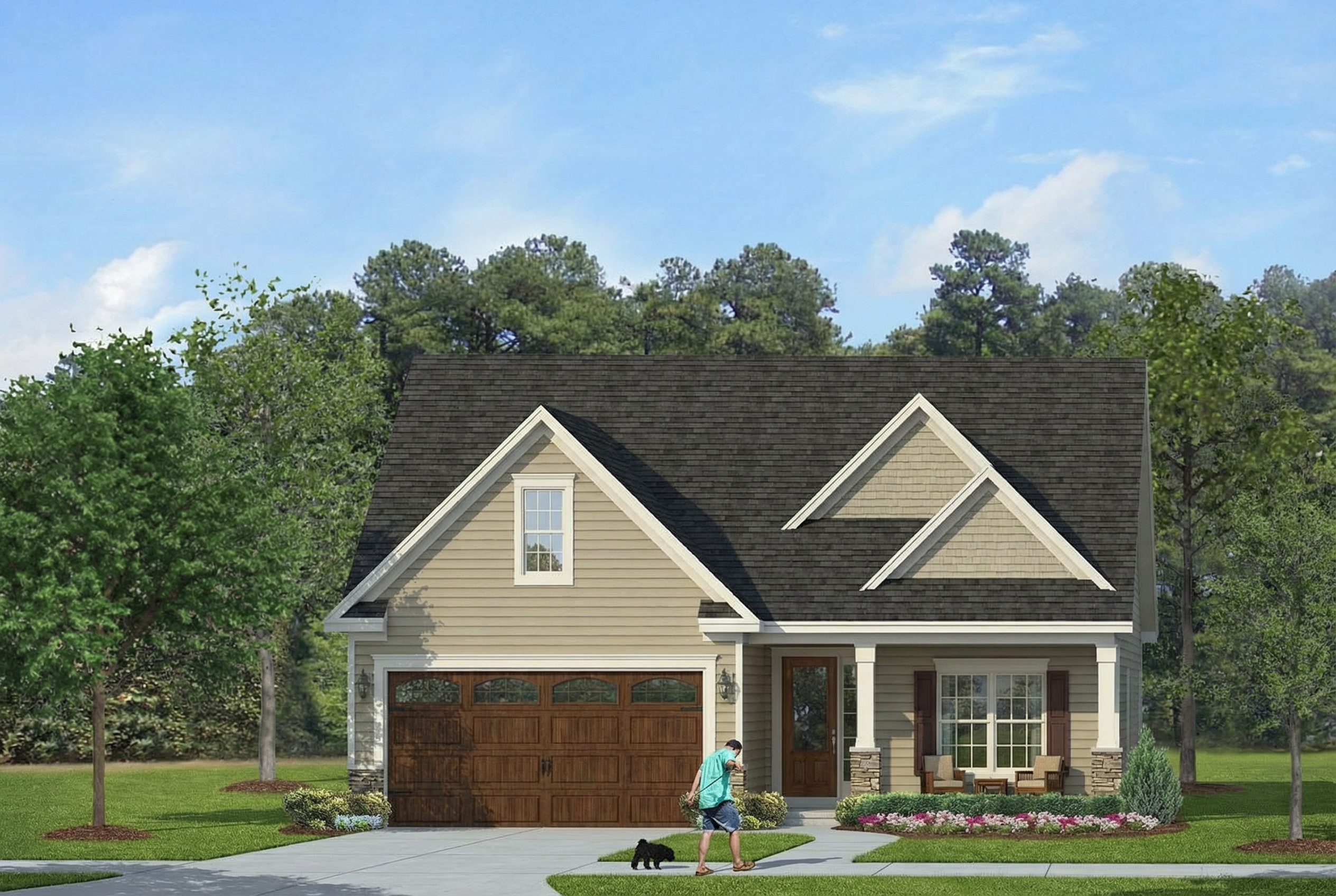 keep all structural elements untouched as well as the angle create a 3d front elevation using the same color scheme no people and pets