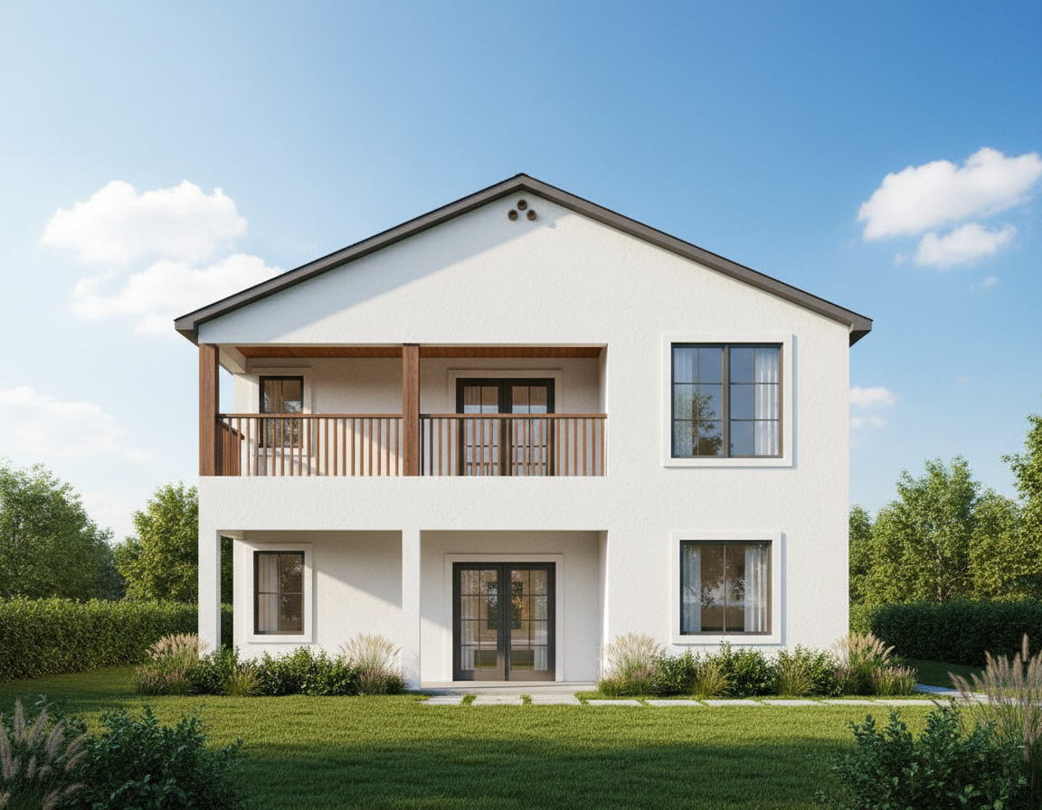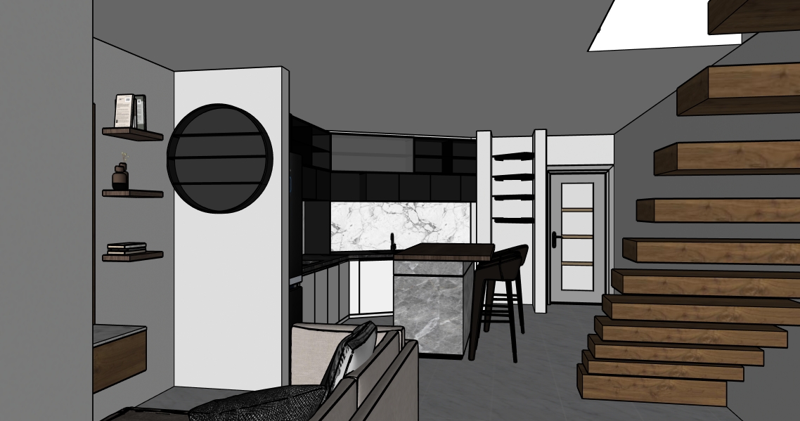 ultra realistic architectural visualization of a contemporary open plan kitchen and living space floating wooden staircase with thick oak steps modern kitchen with dark cabinetry and marble backsplash marble kitchen island with waterfall edges black modern bar stools circular window design feature on white wall floating wooden shelves with decor polished concrete floor soft warm indirect lighting natural daylight from side cinematic interior lighting vray style render global illumination ray tracing highly detailed textures
