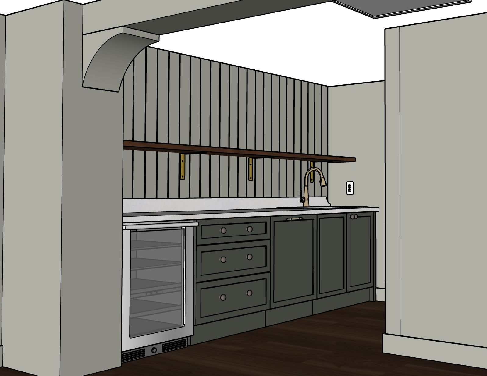 create a photorealistic render of this basement kitchenette the ceiling is alabaster by sherwin williams