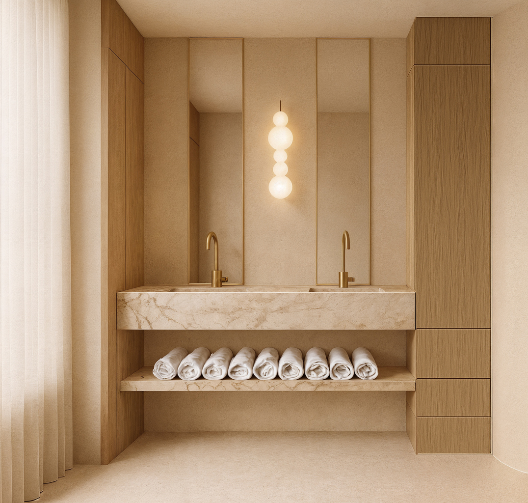 minimalist luxury bathroom interior identical composition and lighting as reference double marble vanity with integrated sinks and brushed brass faucets beige marble with subtle veining warm neutral tones and light oak wood cabinetry three tall vertical mirrors behind the sinks separated by narrow wooden panels a pendant light made of three frosted glass spheres hangs centered between the mirrors under the vanity keep the same marble shelf but place only three neatly rolled white towels on the left side no other towels or objects keep the rest of the shelf empty maintain the same lighting materials colors framing and composition as the reference style contemporary minimalism japandi inspired photorealistic calm and balanced atmosphere soft daylight filtering through sheer curtains on the left camera eye level straight on shot