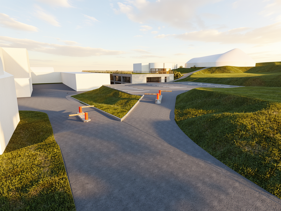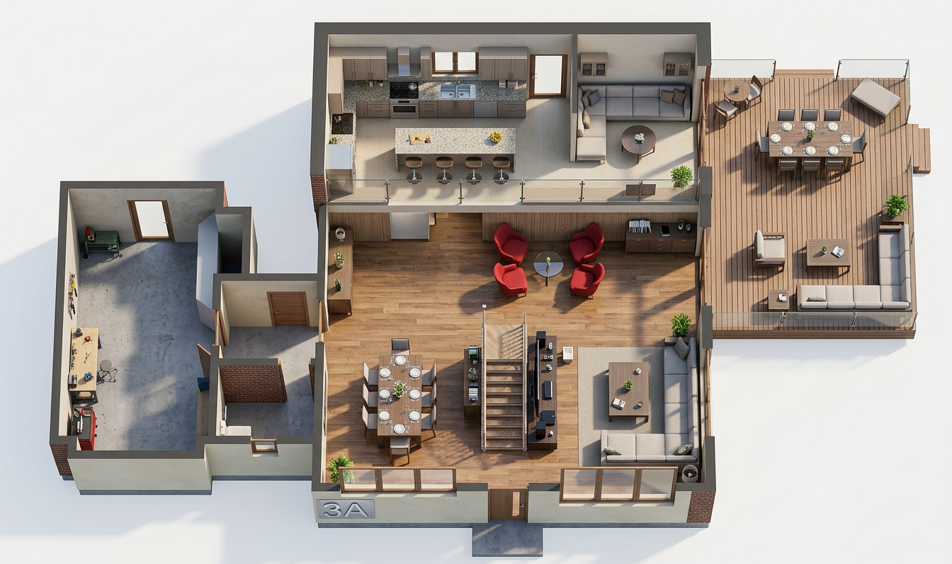 render this powder room elevation slab counter wood cabinets hardwood floor pendants flanking mirror wallpaper on walls and painted darker baseboard