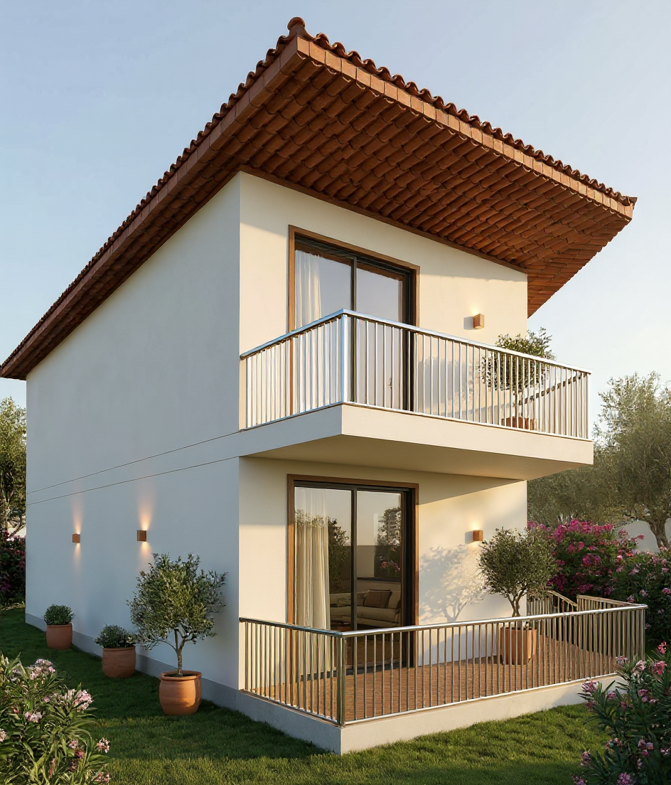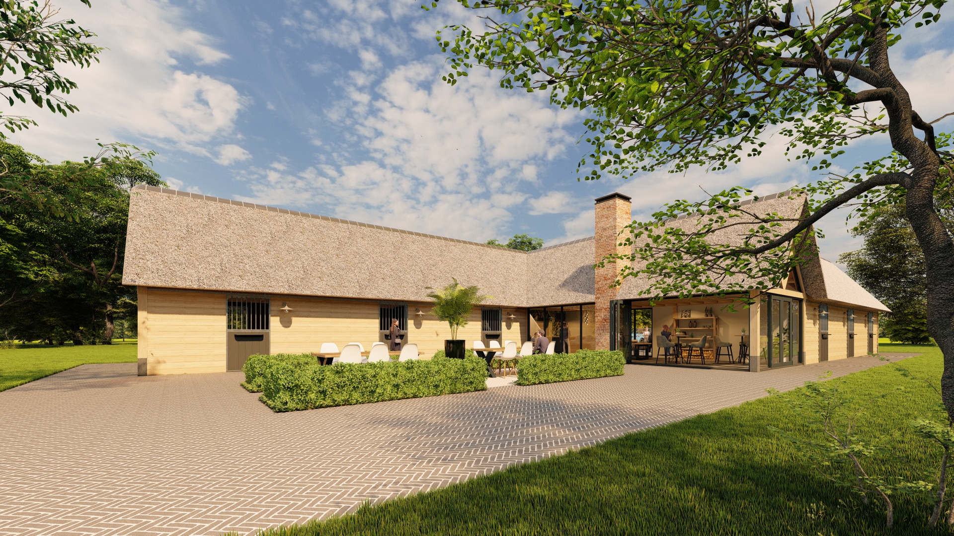 render a stunning modern thatched roof house with a warm inviting atmosphere the house features a beautiful mix of natural textures the roof is a soft beige blending elegantly with the light wood tones of the exterior walls the tall chimney is crafted from rustic red brick large glass doors reflect the lush green trees in the background set against a sky painted with soft blue and patches of white clouds the interior is visible through the glass showing people in a cozy dining setting with warm lighting the paving area is a subtle gray with herringbone patterns complementing the vibrant green of the surrounding grass the whole scene has a harmonious serene atmosphere capturing a perfect blend of nature and modern design