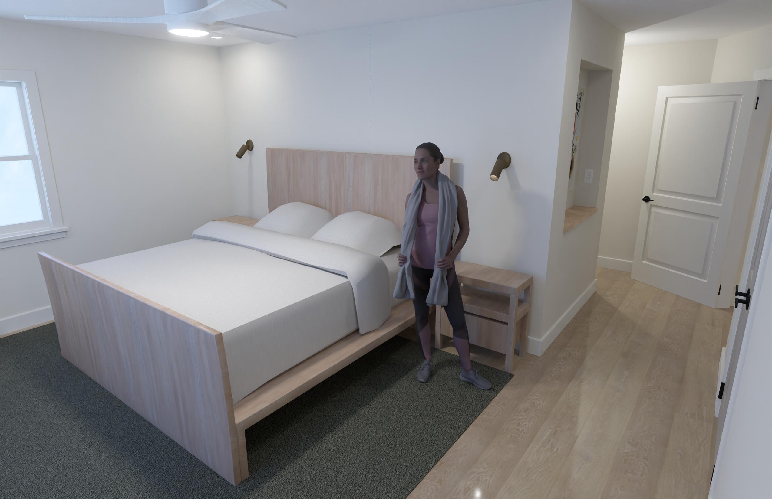 create a cozy and modern bedroom interior featuring a sleek minimalist design a soft warm atmosphere bathed in natural light highlights a large wooden bed with light oak tones dressed in crisp white bedding twin sconces on either side of the bed emit a gentle golden glow the floor is a warm natural wood with a plush charcoal gray rug beneath the bed adding texture the walls are a soft white to enhance the feeling of space and tranquility a figure stands beside the bed wearing casual comfortable attire in muted earth tones a white ceiling fan with a contemporary design completes the serene inviting ambiance add artwork on the walls and plants candles books and small decor to the night stands