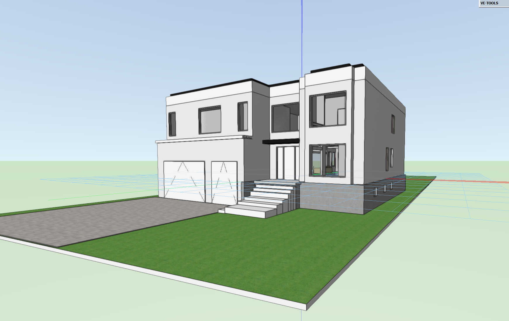 create a photography of a house from this image keep the exact point of view and the exact proportion do not alter the building shape or architectural details from the image 1 the house is located in a suburan neighbourhood in the background and bushes in the foreground 2 the house is a modern stone design