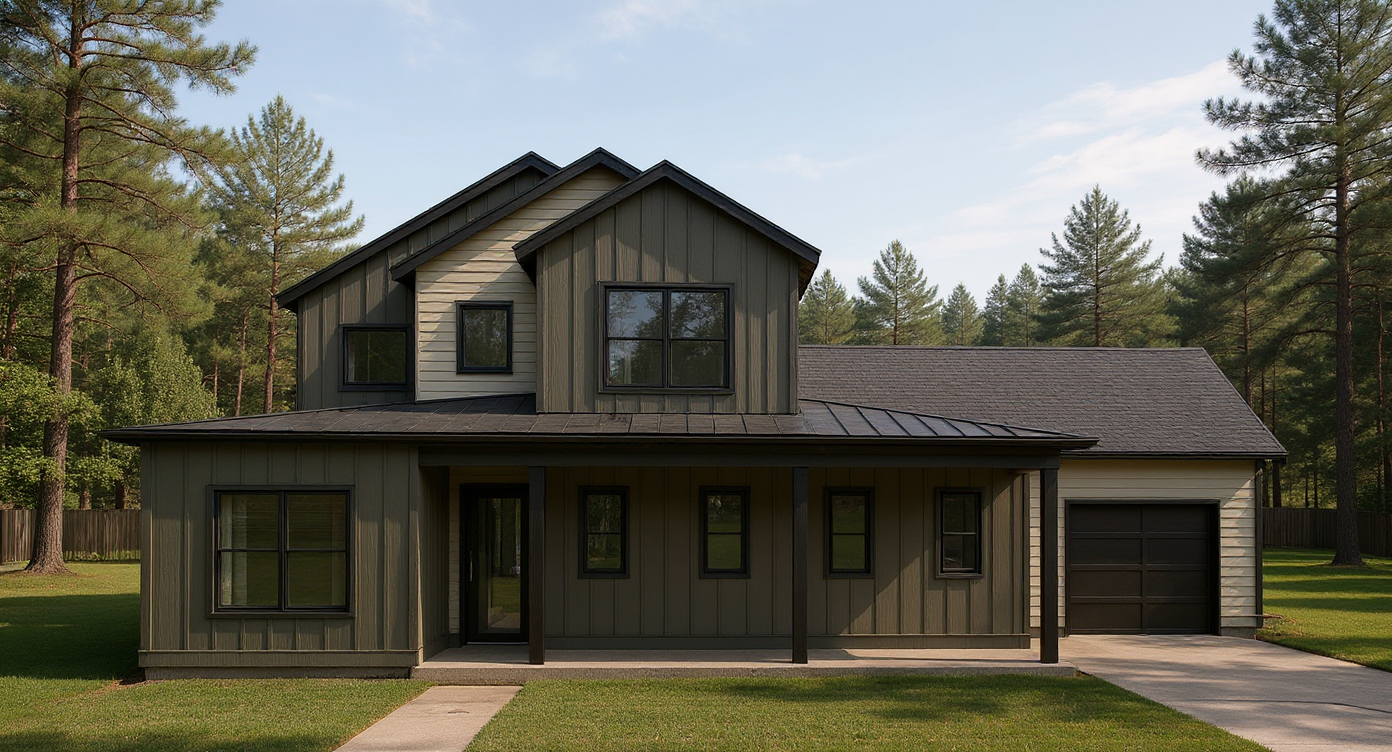 modern house exterior with a minimalist design light gray lap siding dark gray board and batten siding on the main structure charcoal gray asphalt shingle roof large windows with clear glass garage doors in sleek black smooth dark asphalt driveway only in front of garage door on the right driveway is on the side of the house serene afternoon light with a clear blue sky casting soft shadow landscaping including shrubs around the perimeter and neatly trimmed grass for a polished finish low mountains in the background