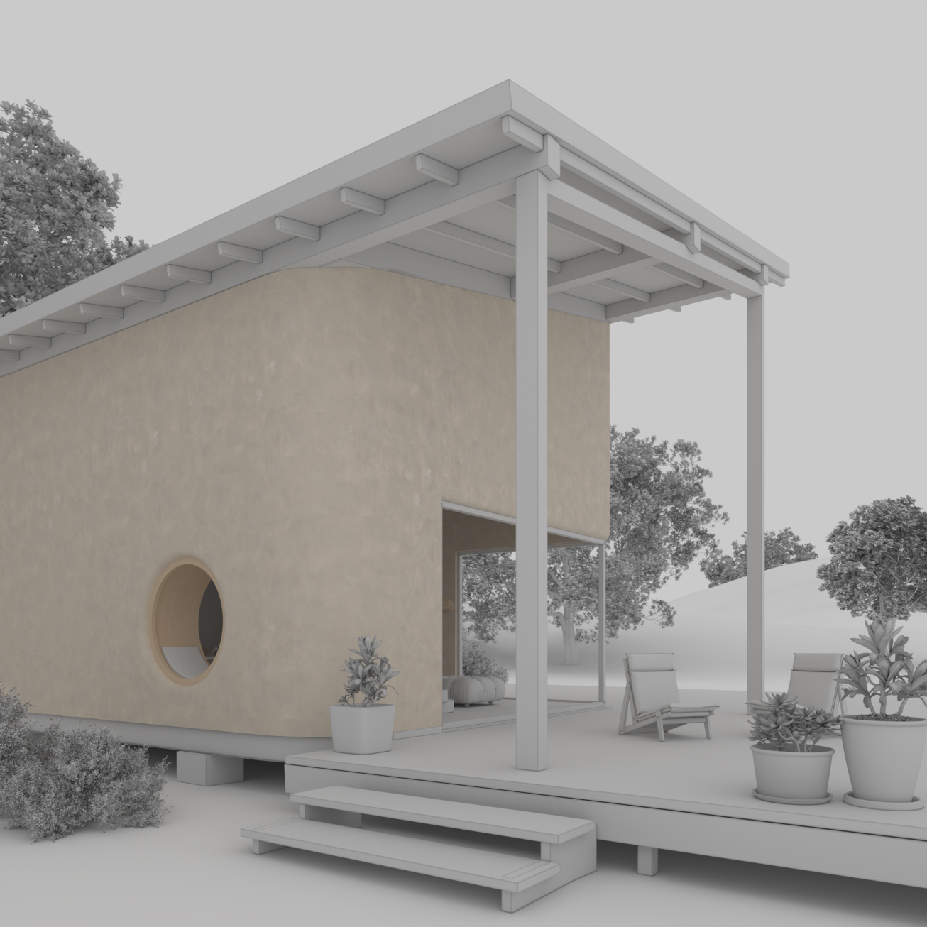 use the provided grayscale clay render as a base for the final image in terms of composition and general massing it is crucial that you do not alter the aspect ratio perspective basic geometry or composition of the clay render only add detail such as enhancing materiality and texture small craftsmanship details etc it is also crucial to avoid 3d rendering feel in the final output it has to look natural as in real life photography from the provided reference image extract the lighting style colour tonality and palette mood material textures and landscaping apply the lighting and materials from the reference image to the clay render to create a photorealistic architectural image of an eco carbon negative building made out of number clay plaster face and hay straw inner filling which is not visible anywhere just putting it here as a point of reference make sure there is dapple shadow in the foreground and on the facade for better composition for the materials we should see smooth clay natural handmade render on the facade it has to feel handmade like it was a celebration of human craftsmanship that means not perfectly flat the main structure supporting the roof is from rustic slightly weather and aged timber trusses they just feel rather new than old the rustic feel is just a finish the smaller roof truss members are from similar type of wood and the roofs soffit is made from wooded planks on the top of the roof we can see a glimpse of metal capping the concrete ground floor slab is raised on concrete footing cubes attached to the building to it there is a raised warmer grey profiled teak timber decking outside lined with beautiful clay pots of all sizes and shapes filled mainly with succulent plants of all kinds of central european species foreground is formed by a beautiful natural lawn with path made with huge flagstone inserted into the lawn and around it beautiful natural bushes catching dappled light and shadows background on the right side is terrain sloping up into a denser english oak grove and beyond in the distance we can see beautiful view into far lands make sure all openings have frames and glazing the final image should be equal to high end architectural photography suitable for luxury property magazines your main objective is to create a photorealistic composite where realism of the lighting and materials has the priority and should be as far away as possible from artificial plastic 3d rendering look prioritise rustic slightly worn looking feel to the clay plaster and timber materials once you finish repeat the action ten more times with random seed to provide me with more options in one go architecture
