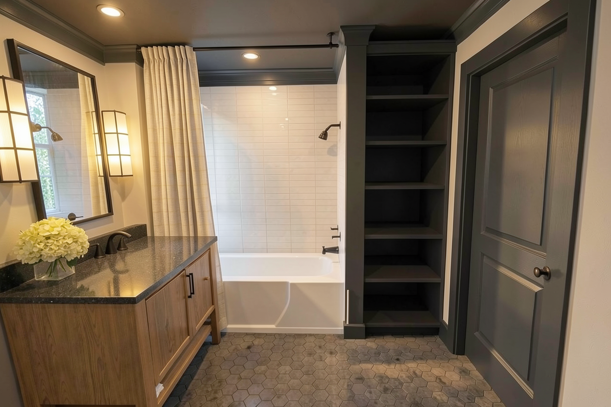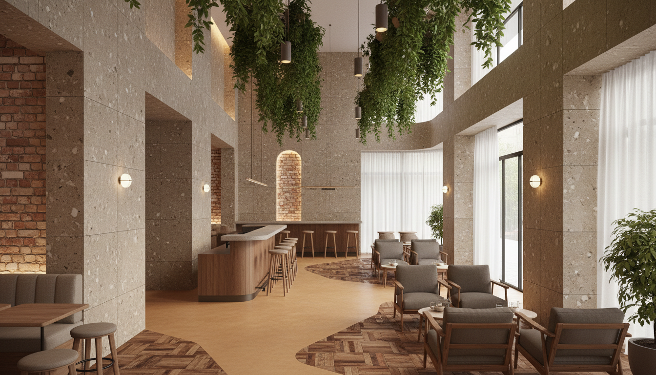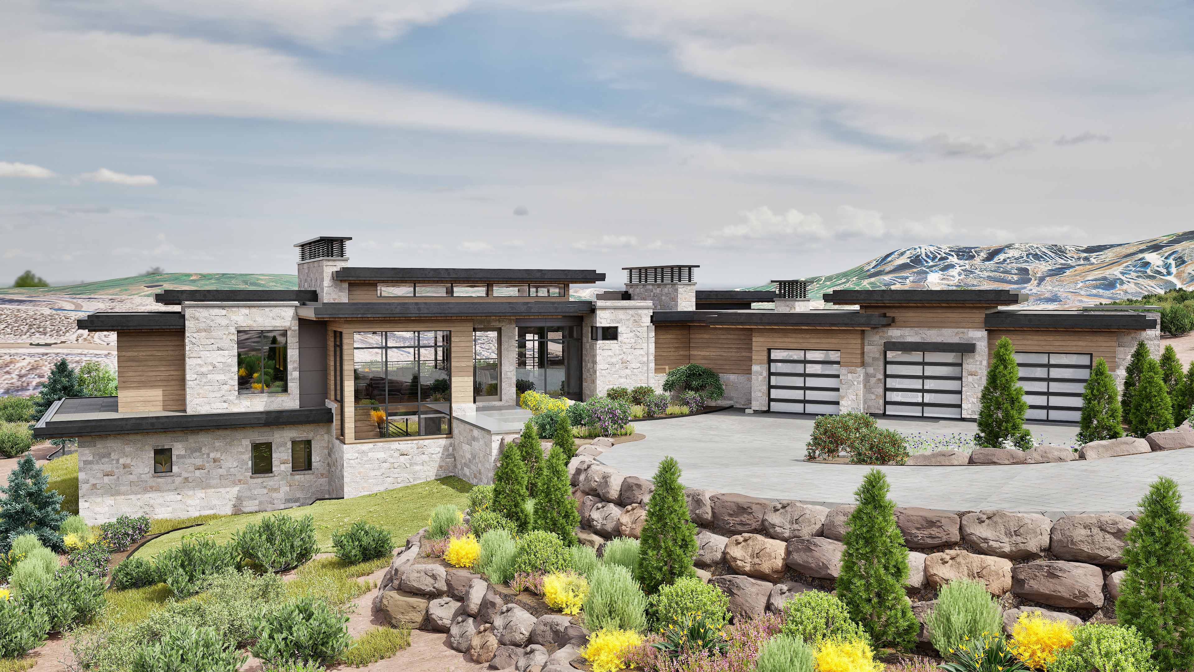 don t change the structure the environment is a semi arid area enhance the materials on the exterior including horizontal brown wood siding white dry stacked stone veneer aluminum dark gray fascia and reflective glass panes change the sky to have more fluffy clouds and more clear skies enhance the vegetation around the house to look more realistic don t change the terrain in the background but enhance it with more realistic trees and dirt