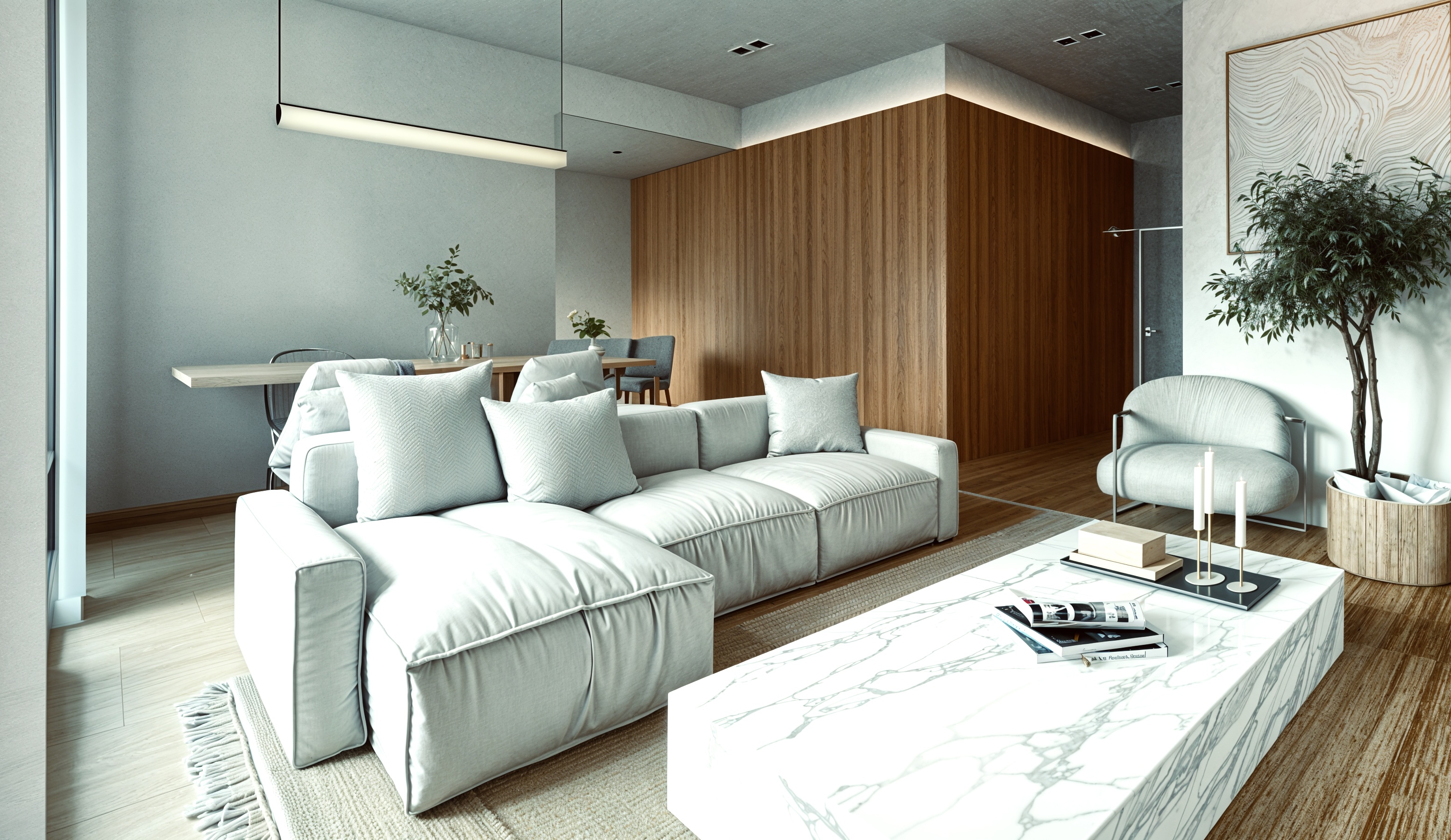 prompt english corrected hyperrealistic architectural editorial photograph of a contemporary living room strictly preserving the original composition camera position proportions and lighting of the reference image no redesign only correction and enhancement of material realism and spatial coherence the vertical panel wall at the back must remain fully clad in natural wood with a continuous high quality finish in warm oak tones the wood should present subtle tonal variation fine linear grain and natural imperfections avoiding any flat or artificial appearance the surface must absorb light softly with realistic depth and slight variation between panels the door integrated within this wooden wall must be a clean minimalist white door flush with the wall plane but clearly readable it should have a matte lacquered finish perfectly smooth yet slightly light absorbing avoiding excessive reflectivity the edges must be crisp but physically plausible with a very subtle shadow gap or joint defining its perimeter no handles or hardware should be visible maintaining a seamless and refined look remove completely any unnatural or ambiguous element emerging from the upper left corner of the door the wall door junction must be clean continuous and geometrically coherent with no visual artifacts protrusions or distortions all other materials in the scene must be enhanced to achieve an editorial high end realism the sofa upholstery should show soft fabric tension micro wrinkles and natural compression avoiding overly smooth or inflated cushions the marble coffee table must display refined veining with subtle depth slight translucency and a polished surface with controlled non perfect reflections the wooden floor should show fine grain slight tonal variation and realistic light falloff avoiding repetition painted walls must have a matte mineral finish with very subtle texture and soft light diffusion lighting must remain soft and indirect with a poetic editorial atmosphere enhance global illumination soft shadows and realistic contact points between surfaces avoid overexposure and maintain a balanced dynamic range all edges walls ceiling junctions must feel constructed with minimal rounding to avoid sharp cg like geometry the final image should read as a high end architectural photograph with perfect material depth coherence and realism