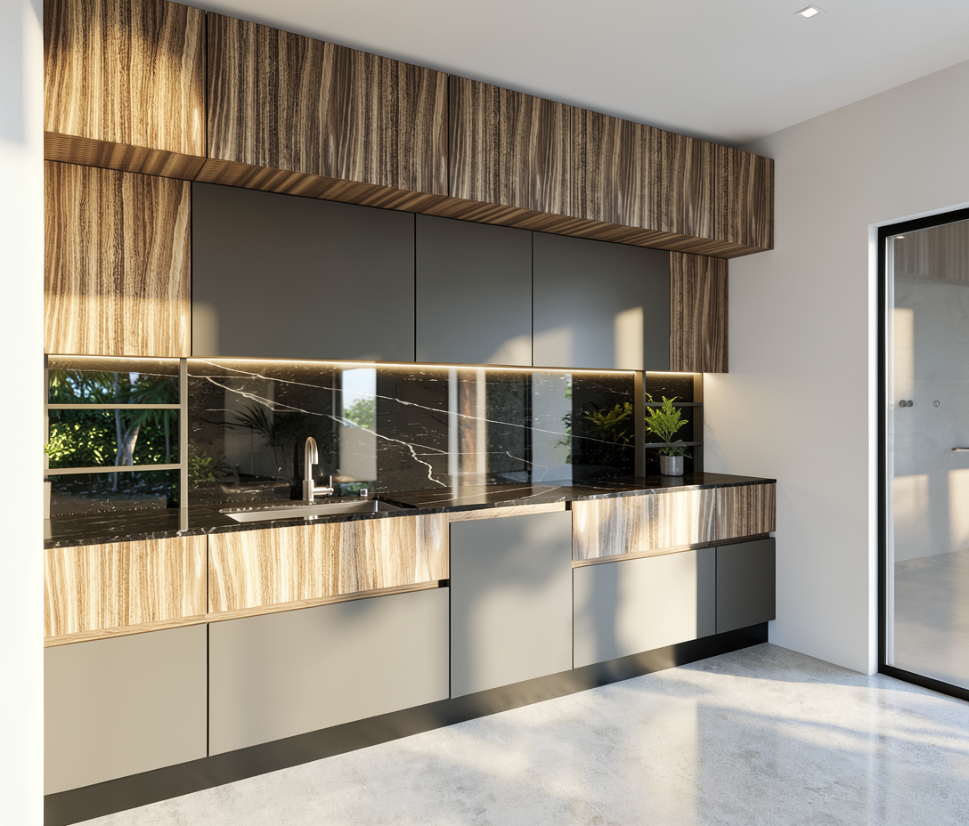 modify element element id left dark grey wall with artwork action retexture material type stippled concrete stucco material details replace the entire smooth dark grey surface of the left focal wall with a smooth hand applied cement plaster this new surface must precisely replicate the detailed multi directional stippling and relief pattern seen in the texture reference image image 0 png the concrete texture should have a light to medium grey tone and a tactile stippled quality with both the overall field pattern and the smaller detailed stippling from image 0 png integrated seamlessly across the wall the texture must interact realistically with the bright direct sunlight coming from the window catching highlights and casting small complex shadows within the stippling while retaining the overall large scale shadow pattern from the palm tree the existing large abstract canvas art which is also preserved in its position the plant vase on the lavender dresser and the dresser itself must remain in their original positions now floating over the new textured concrete wall preserve details element preserved art description the large abstract canvas art remains in place on the retextured wall element preserved dresser description the lavender dresser with the plant vase remains below the artwork element preserved other elements description all other room elements including the window curtains armchair lamps bed and right side wall art remain unchanged element preserved lighting description the existing strong daylight and large palm tree shaped shadows must remain and integrate with the new surface texture