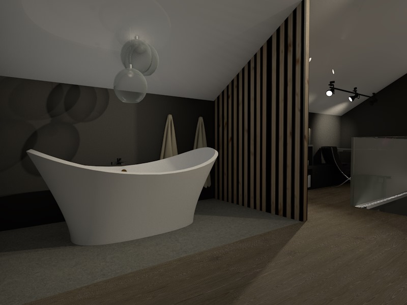 modernist interior shot render a modern elegant bathroom with a freestanding white bathtub as the focal point create a serene ambiance with soft ambient lighting use a dark gray color for the walls to add depth and choose a warm natural wood tone for the floor the ceiling should be a subtle light gray to complement the overall atmosphere enhance the mood with soft shadows and highlights reflecting a calm and sophisticated atmosphere architecture