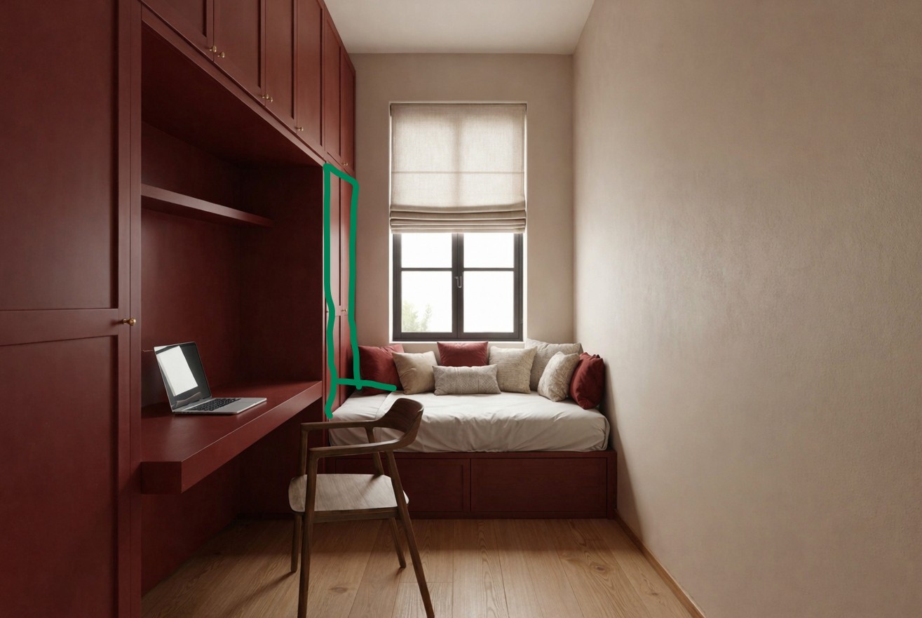 inbuilt bed in red cabinet make niche in cabinet in the area marked green