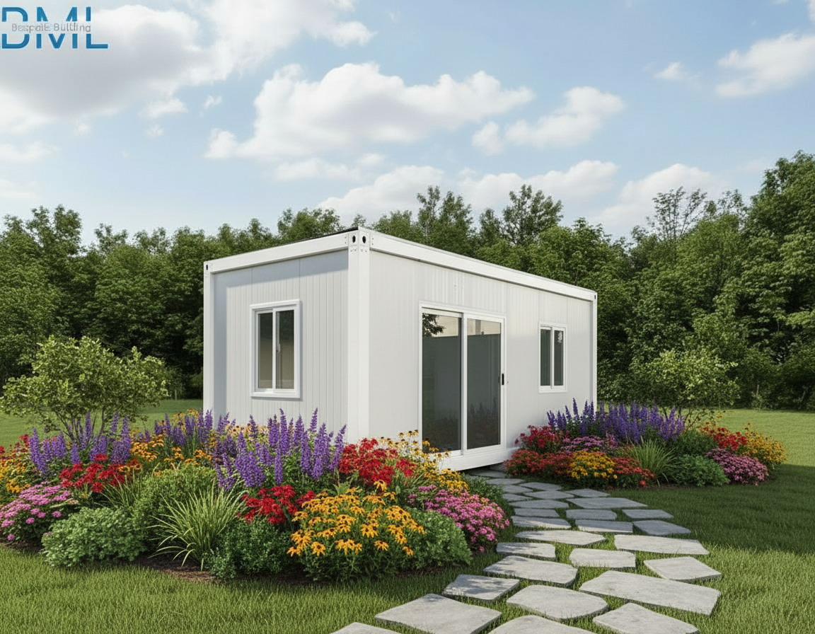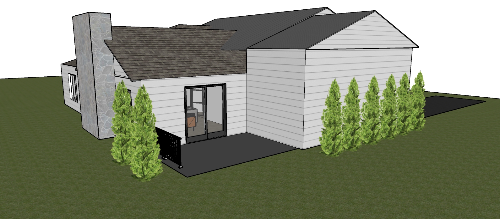 canexel gris pale sur toute la maison retire toutes les plantes ajoute la toiture en metal sur la partie droite ajoute des fascia