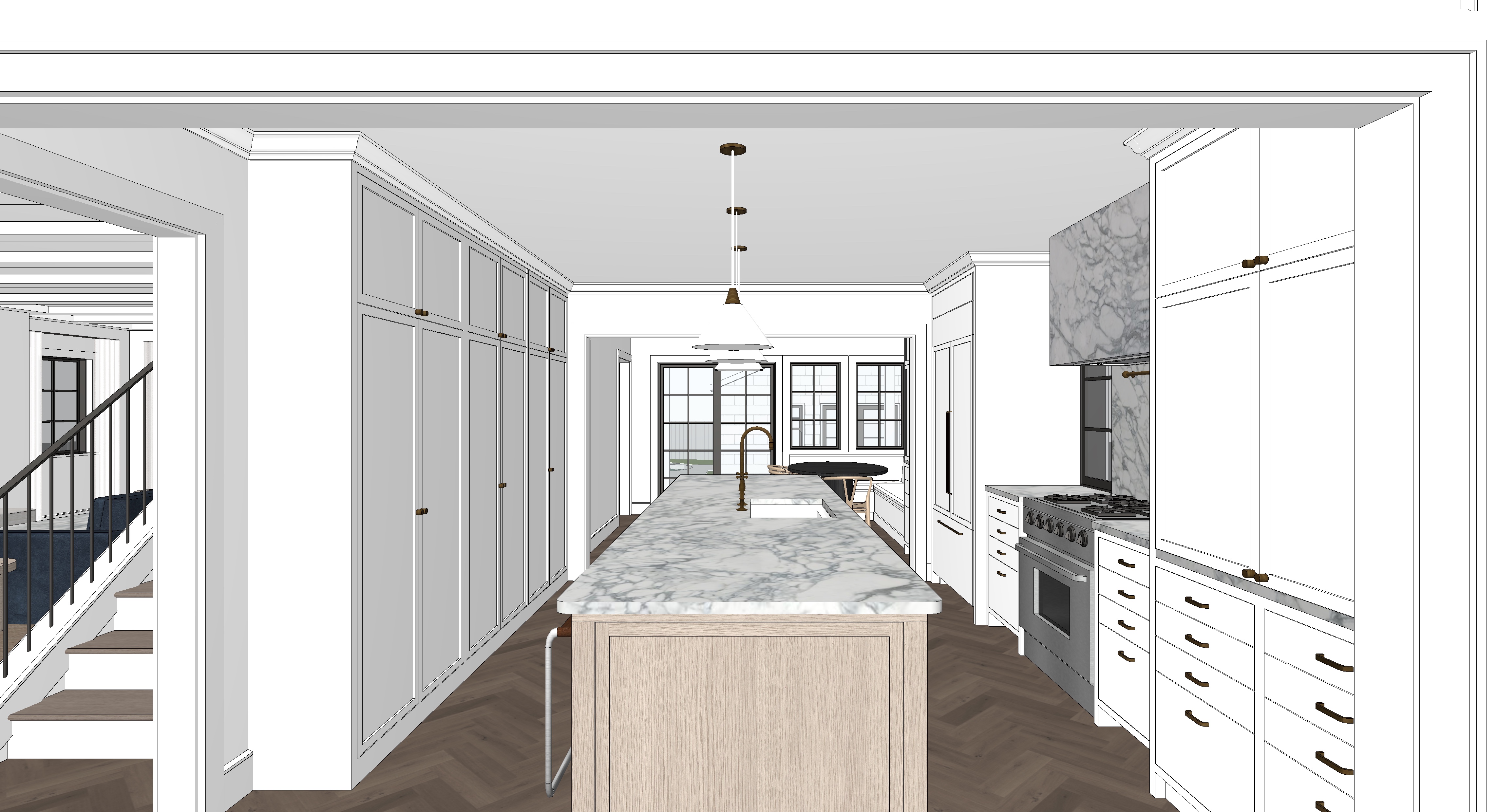 create a beautifully rendered modern kitchen featuring white cabinets with elegant bronze handles a kitchen island adorned with a luxurious white marble countertop include a brushed brass faucet above a porcelain sink the flooring is a sophisticated dark herringbone wood make sure the ambient light is soft and warm enhancing the calm and inviting atmosphere the walls are a light dove gray to complement the white and bronze accents with sleek pendant lights in warm brass hanging above the island include a glimpse of a staircase with dark wooden handrails and white steps for contrast reflecting a seamless blend of modern elegance and classic charm a spacious kitchen features a large central island topped with white marble with grey veining and a light wood base white shaker style cabinetry with dark metal handles lines the walls centered between the cabinets on the right is a marble range hood and backsplash over a professional grade stainless steel stove flanked by two black framed steel windows dark wood herringbone flooring covers the room leading the eye toward a dining area with large black framed steel windows in the background natural daylight fills the space highlighting the clean lines of the tall storage cabinets and the pendant lights hanging above the island