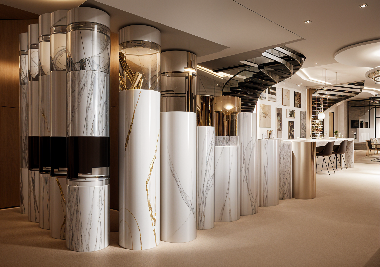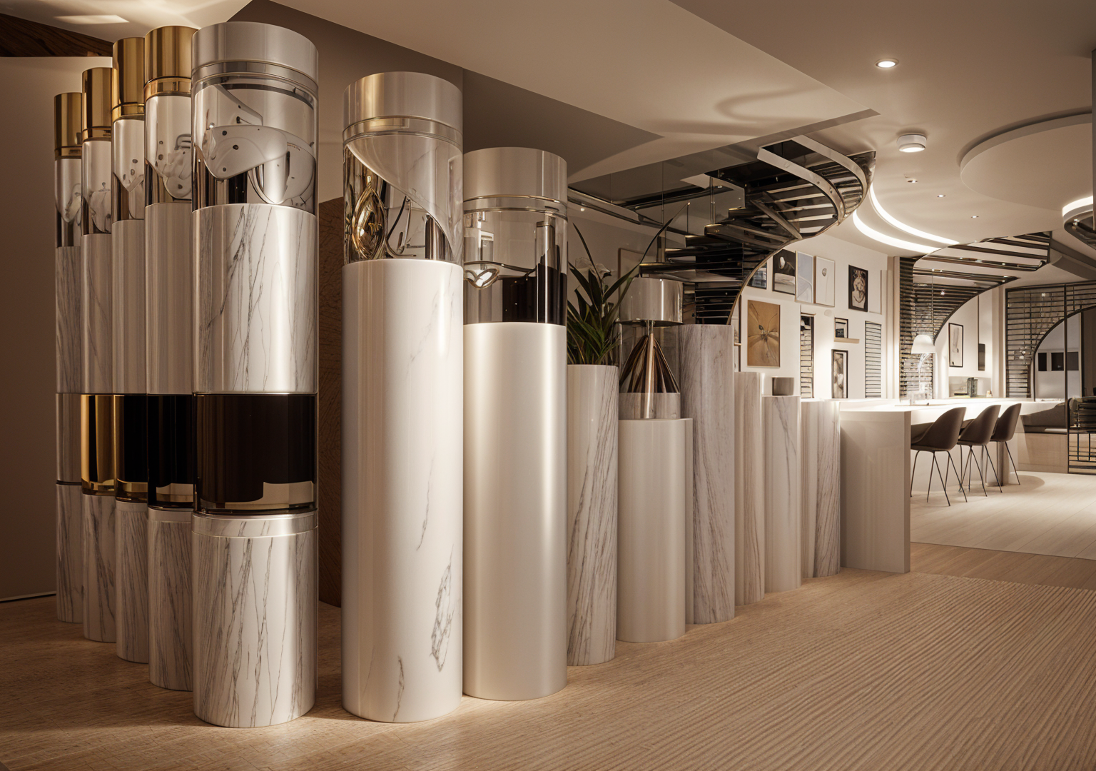 interior shot design a jewellery store interior incorporating ornate cylindrical columns decorated with intricate moroccan inspired geometric tile patterns in earthy tones and jewel like colors the detailed mosaic pillars should stand as artistic highlights within a minimal modern jewellery showroom ensure the tiles craftsmanship is captured with high detail and realistic textures place glass display cases around creating a fusion of traditional artistry with modern luxury design a jewellery store interior incorporating ornate cylindrical columns decorated with intricate moroccan inspired geometric tile patterns in earthy tones and jewel like colors the detailed mosaic pillars should stand as artistic highlights within a minimal modern jewellery showroom ensure the tiles visualize a jewellery store interior with tall cylindrical columns covered in a 3d geometric tile pattern transitioning in gradient shades from white at the top to deep cobalt blue at the base ensure the glossy texture of the tiles reflects the lighting elegantly the pillars should add a contemporary artistic touch to the space standing beside sleek glass jewellery showcases the overall mood should feel modern bold and luxurious