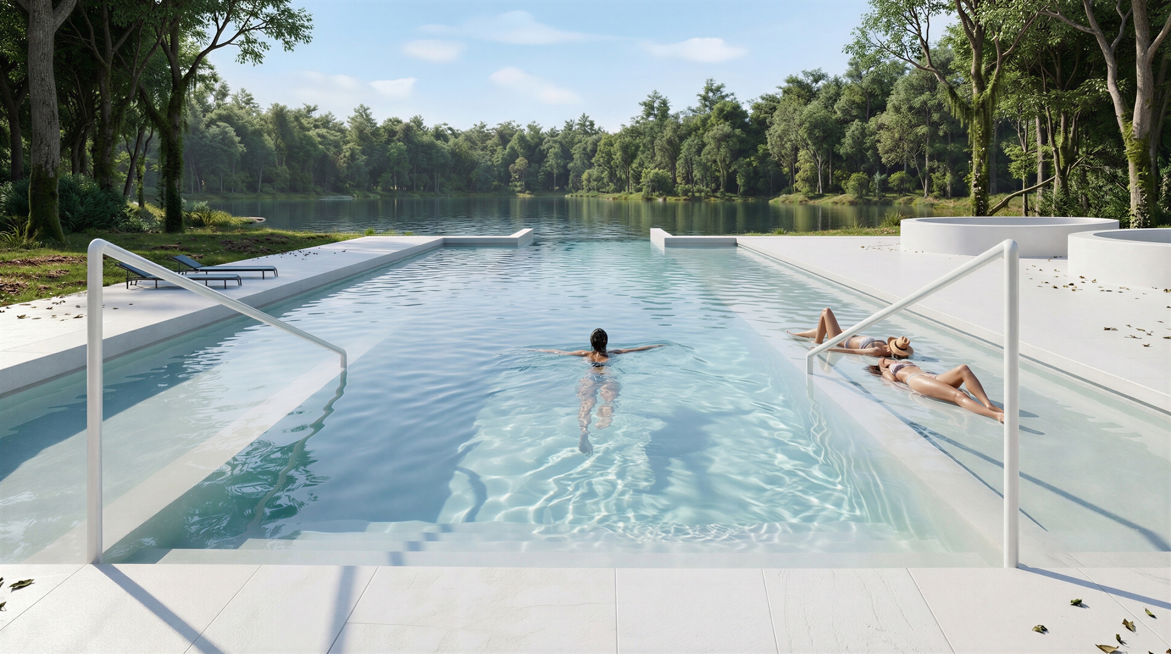 transform this image into a hyper photorealistic architectural visualization no trees in the foreground keep foreground completely clear of any trees or large vegetation replace all non realistic materials with lifelike versions maintaining the dominant color palette add natural subtle sheen and glossy highlights on metals glass wood surfaces create realistic textures on concrete plaster and fabrics with micro details change background layout immediately behind the grass strip separating the pool from the lake create a wide panoramic lake view stretching fully from left to right edge of frame no trees between pool grass and lake clear open water surface with gentle ripples realistic depth only then further in distant background place dense forest with trees enhance surrounding environment to ultra realistic quality while preserving exact structure and shape of bushes trees grass and lake detailed bark textures with moss on trees natural leafy density variation on shrubs short grass blades mixed with soil patches reflective lake surface realistic shoreline details preserve natural forest floor under trees as woodland litter and earth leaf litter pine needles moss patches soft brown soil texture blending seamlessly add precise environmental reflections in every glass pane capturing surroundings bright high key lighting throughout with even daylight illumination no harsh shadows clear blue sky with soft clouds ultra detailed 8k photorealistic render professional architectural photography style