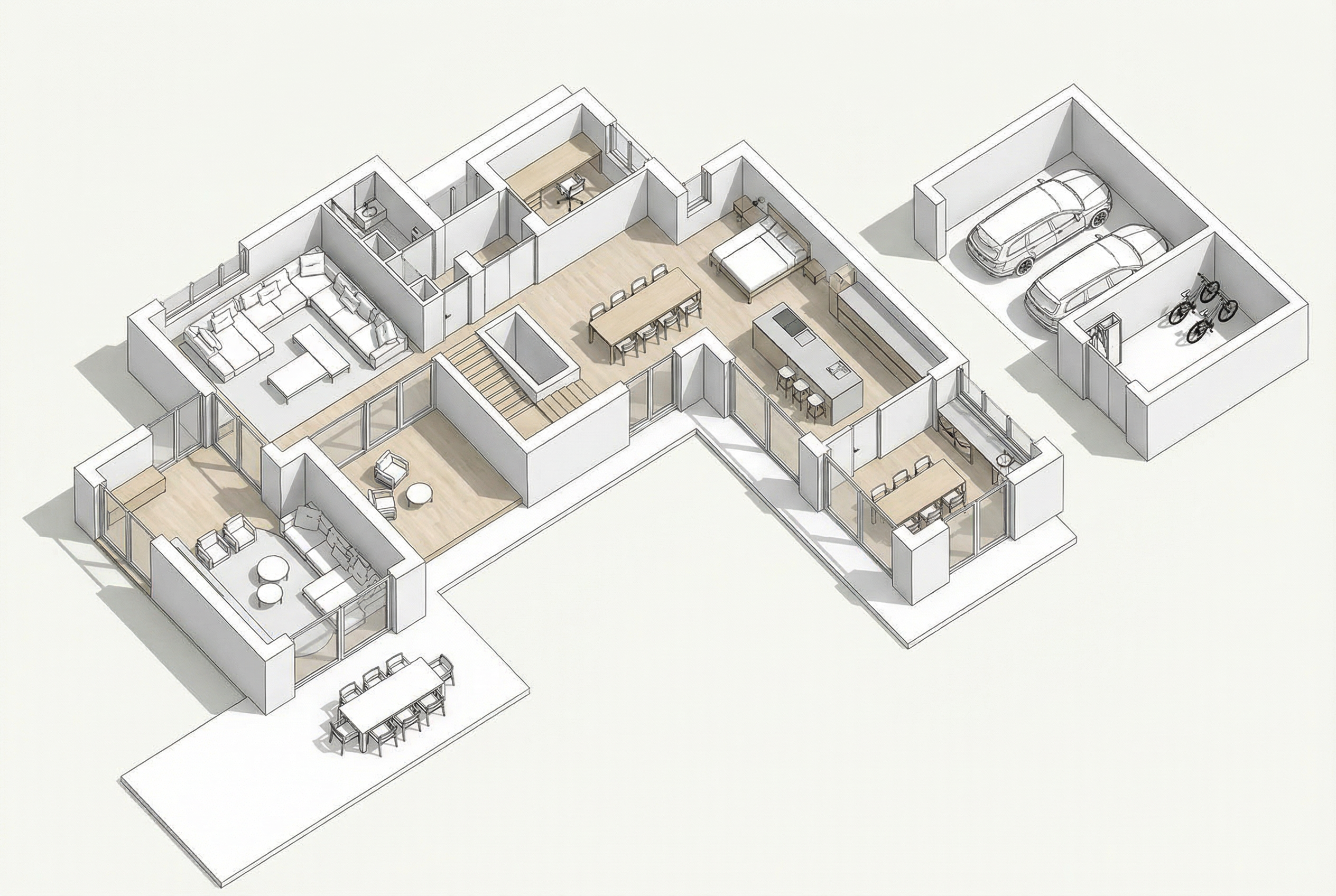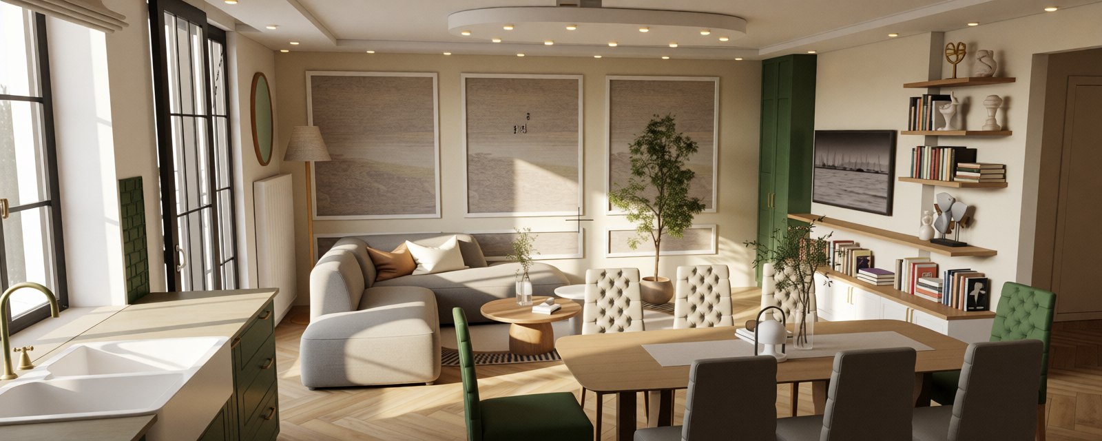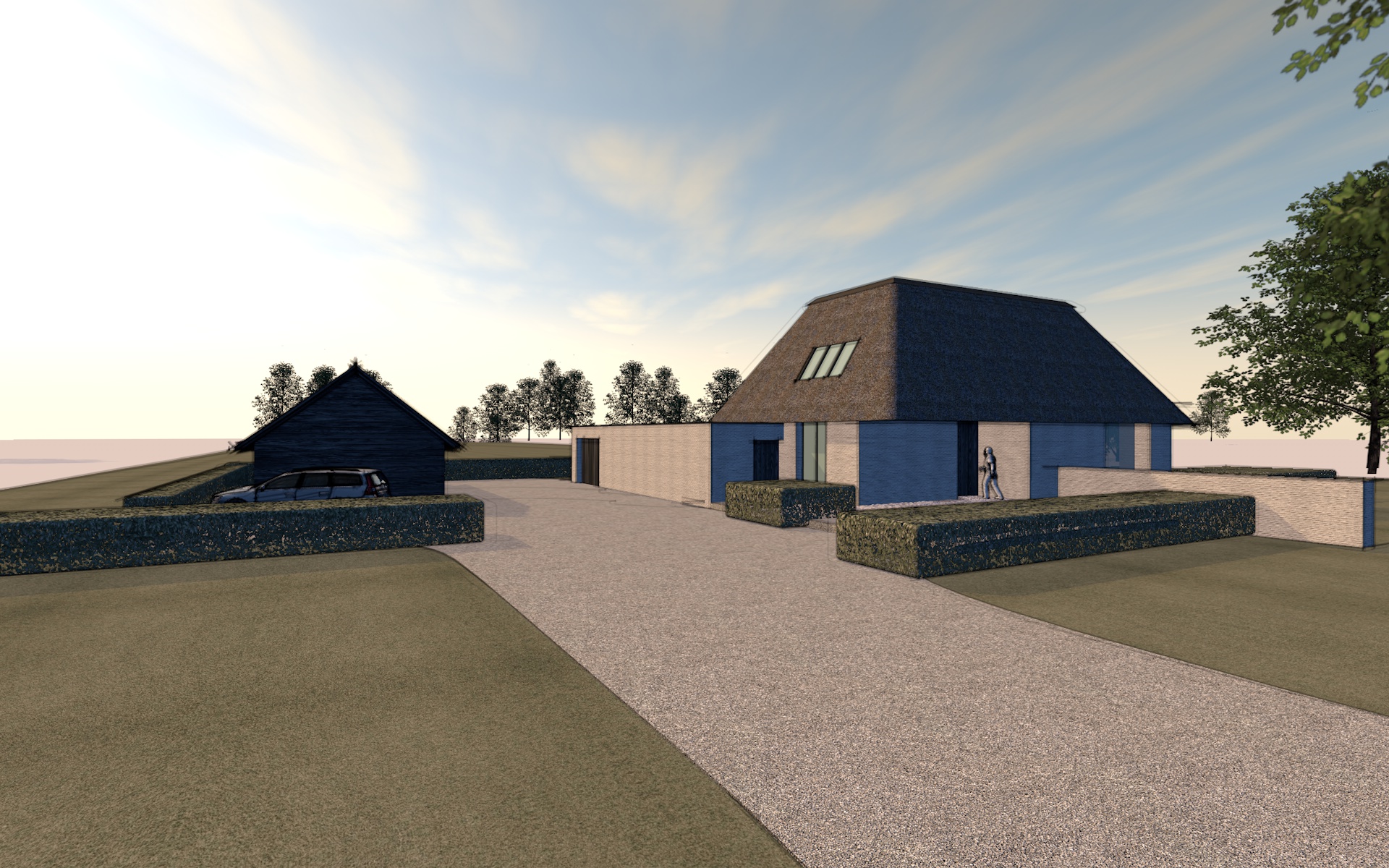 transform a serene countryside scene with two modern houses first house rich navy blue walls with a textured wooden roof in warm brown tones large glass windows reflecting the soft sunlight second house in the background deep charcoal exterior with muted black roof subtle reflections driveway smooth light gray path connecting both houses hedges dense greenery deep forest green nicely trimmed trees lush and full vibrant green leaves swaying gently sky clear with soft flowing clouds in pale blue and hints of pink atmosphere calm warm afternoon glow peaceful rural setting