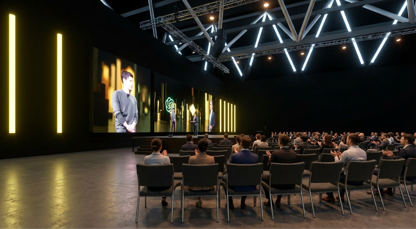 a dark immersive stage environment with an oversized suspended led screens add business people in smart casual work clothing in the audience pale yellow truss reflection