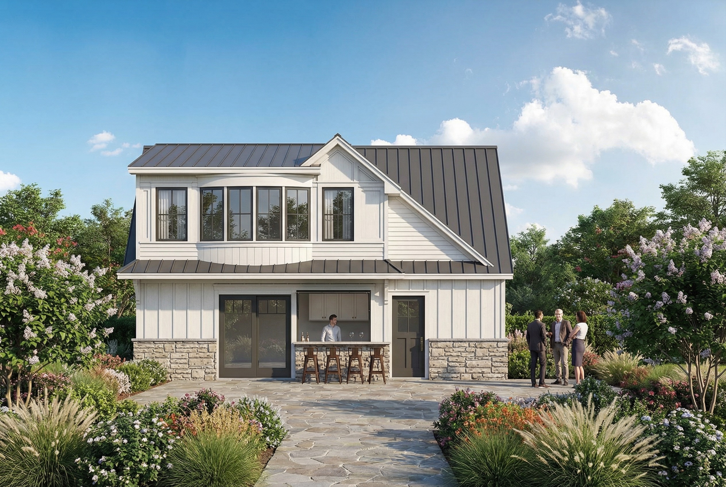 pool house with a large kidney shaped pool in front add an outdoor shower to the left of the sliding glass doors show a family enjoying a beautiful summer afternoon with their kids