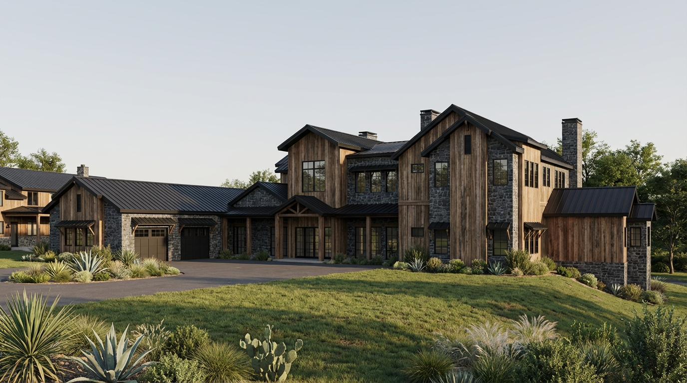 exterior shot updated this elevation to have glass doors with rounded tops on the right hand side change all of the green wood to a light maple wood