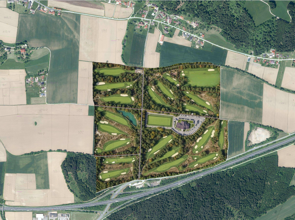 rooftop shot aerial view of a lush vibrant golf course surrounded by expansive farmland the golf course features vivid green fairways and darker green putting surfaces artfully contrasted with bright white sand bunkers the surrounding farmland is a patchwork of muted earth tones light beige golden yellow and darker brown fields small clusters of trees with deep green foliage border the course adding natural texture the atmosphere is serene and clear under a bright azure sky with a gentle warm sunlight illuminating the landscape architecture