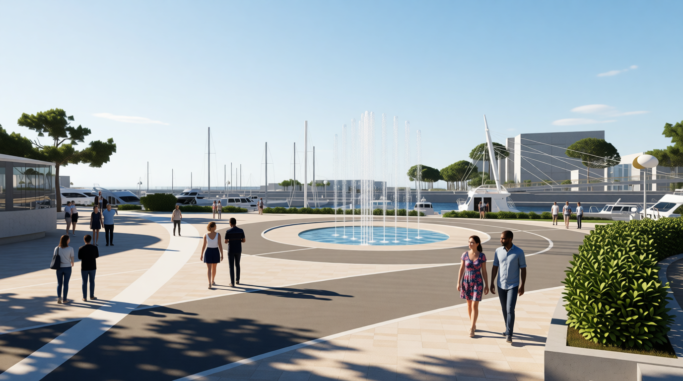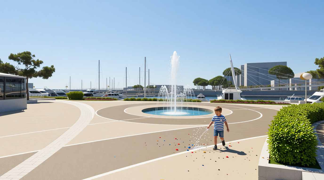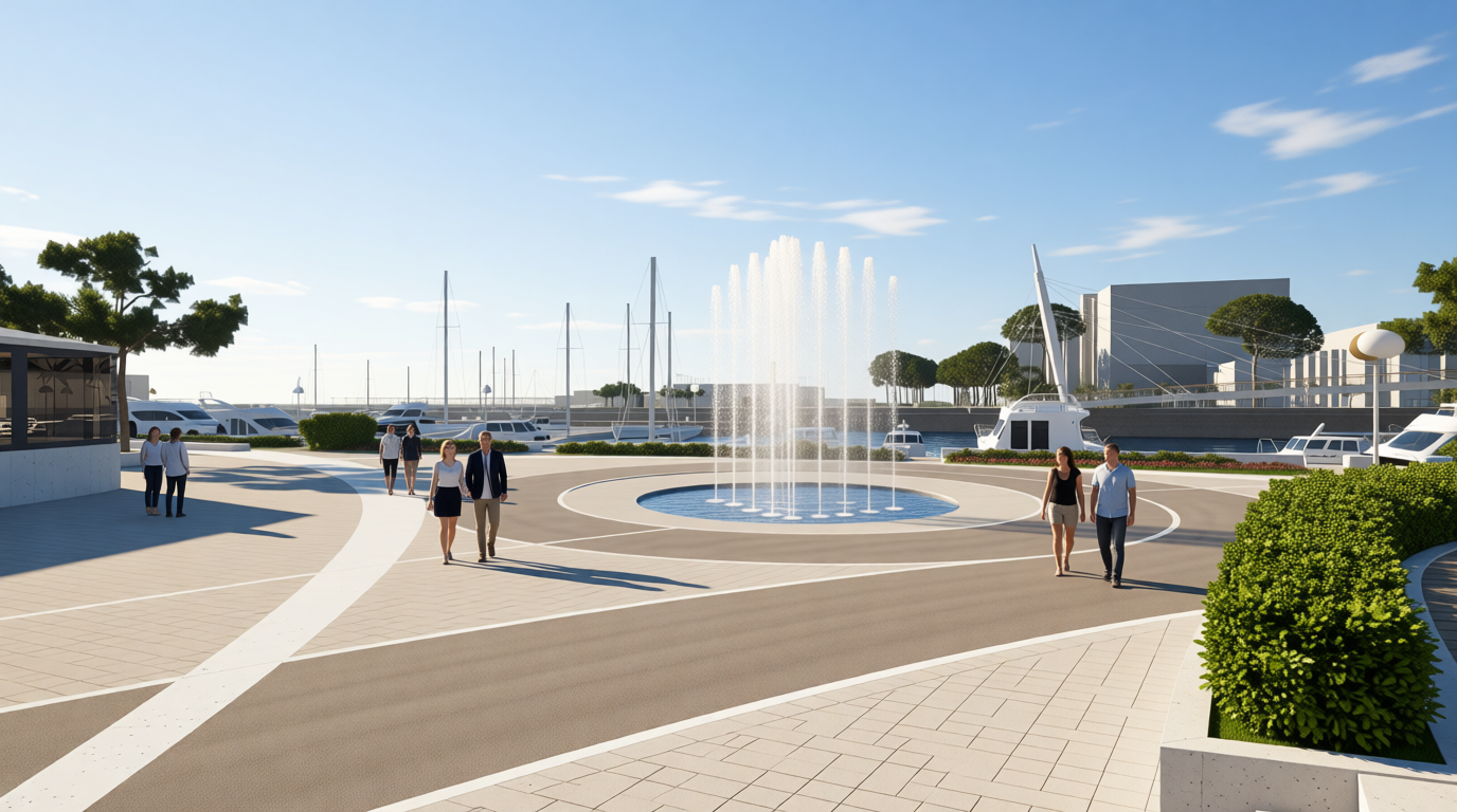 enhance vegetation and insert some people walking in summer in many directions make also the fountain more visible you can add some small clouds so that the sky contrasts with the color of the water