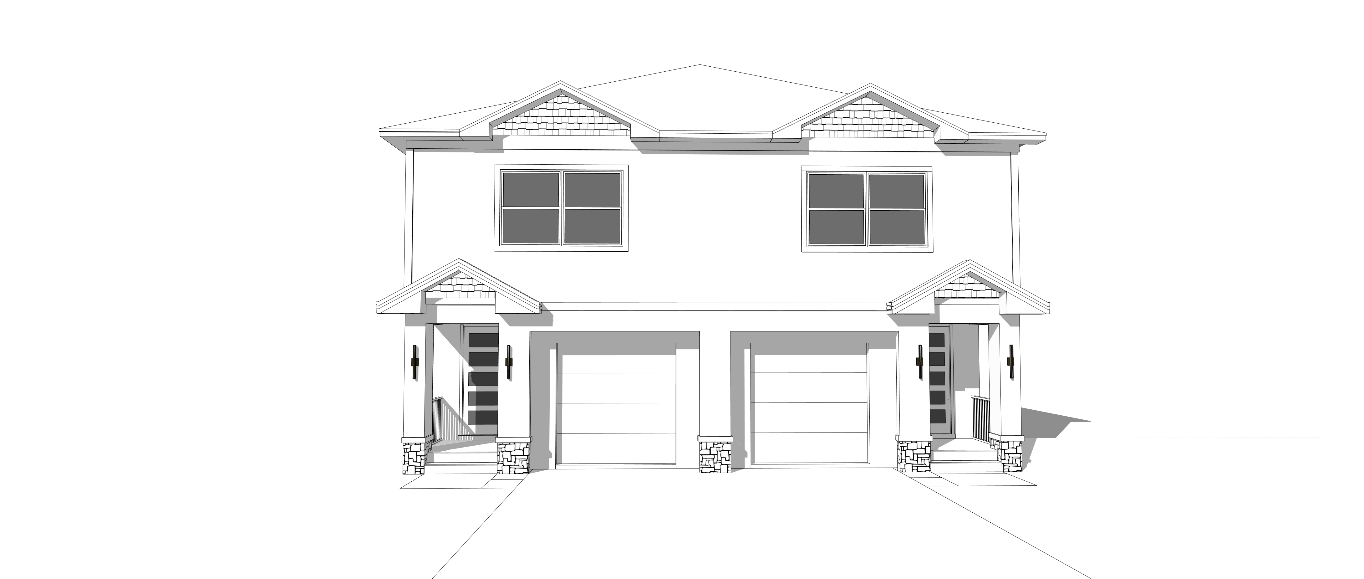 photo real rendering house paint sherwin williams snowbound black shingle roof front door is sherwin williams color naval gray paver driveway and walkway lush florida landscaping on a bright sunny day