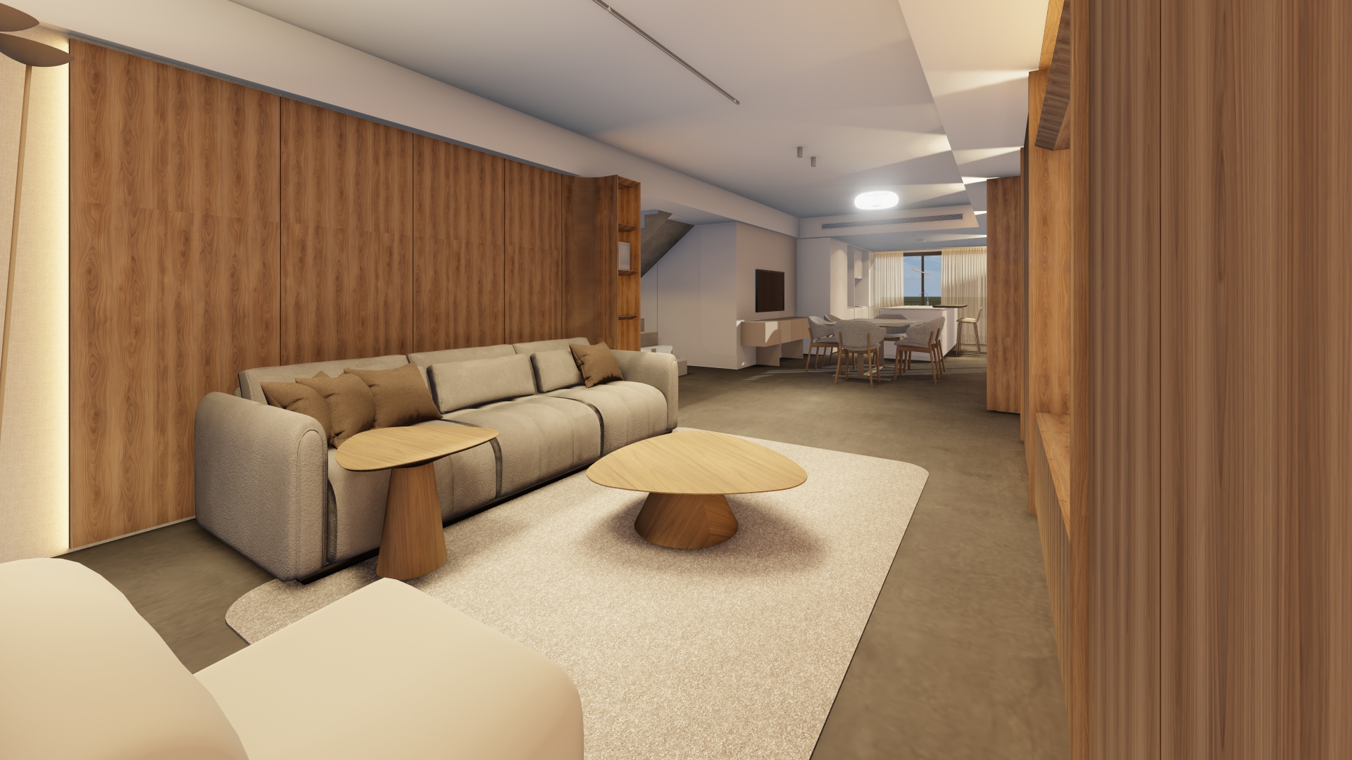 render this image in a realistic style maintaining the exact same composition furnishings lightning and design without adding or removing elements the wood should be extra light brown like desaturated and the floor is gray ceramic like polished concrete