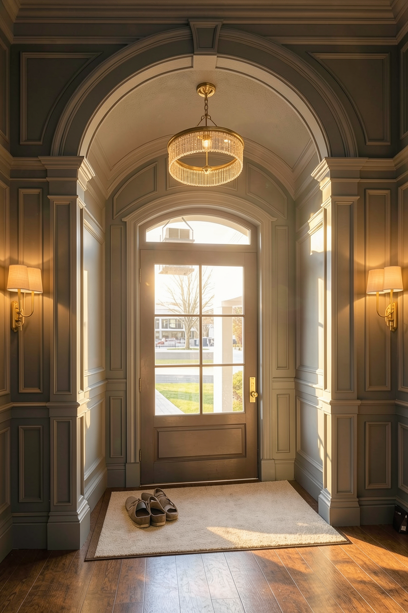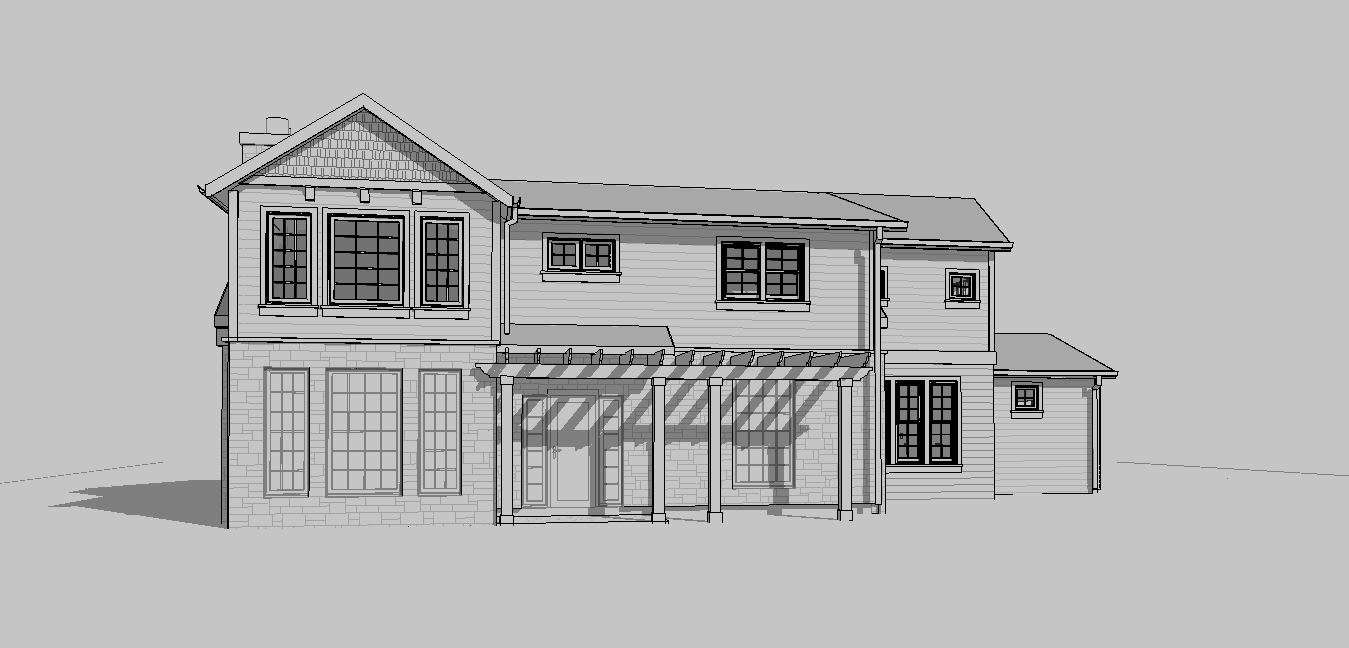 cape code style house subtle white horizontal siding and trim work stone base grid windows entry patio with trellis walkway to door with mowed grass a couple large trees in background