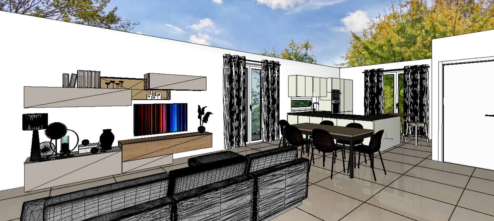 keep the colors of the furniture make a sofa with a fabric in warm tones on sand with texture put a white ceiling over the entire composition