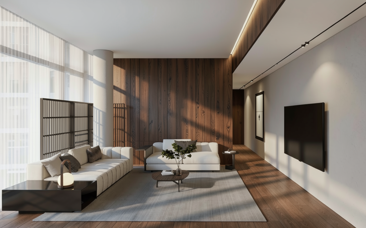 floor light natural oak in a herringbone pattern not fully whitened bleached kitchen natural oak veneer white countertop the other furniture and doors also in natural oak veneer dining table in solid wood keep all elements as they are same sizes and placements and roughly the same colors just make it look realistic strictly matching the exact space and dimensions from the reference images kitchen is handleless no visible pulls bookshelf should be white and filled with many books mostly full the lower part of the bookshelf should have white handleless cabinet doors add curtains to the windows in a light pastel colour add a cream coloured low pile rug under the sofa handles and similar hardware elsewhere should be silver brushed stainless steel