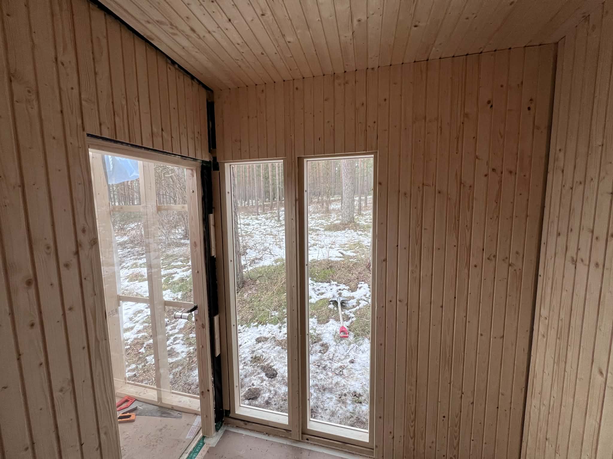 finish the sauna paneling around the windows door and corners of the space to the right of the window there will be a harvia linear 16 bastuaggregat facing the door with a stainless steel chimney going up through the roof above it