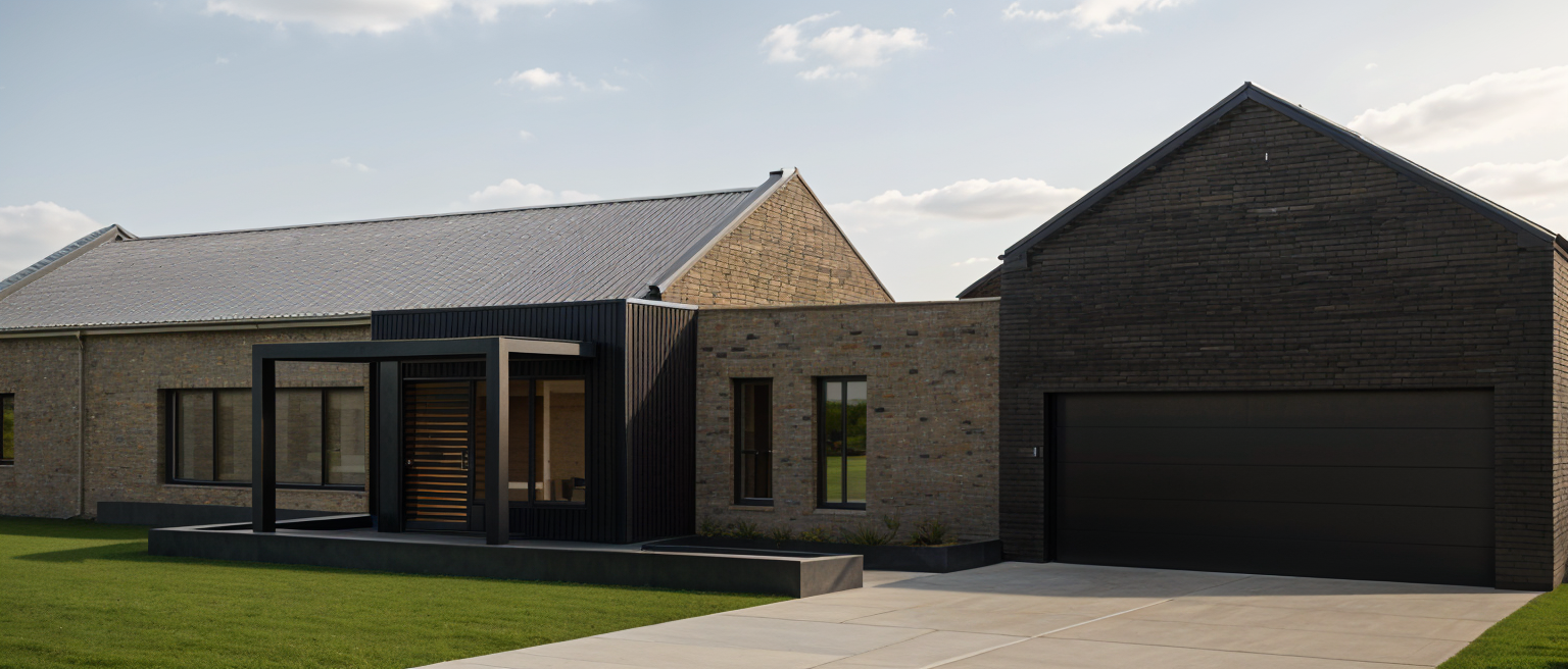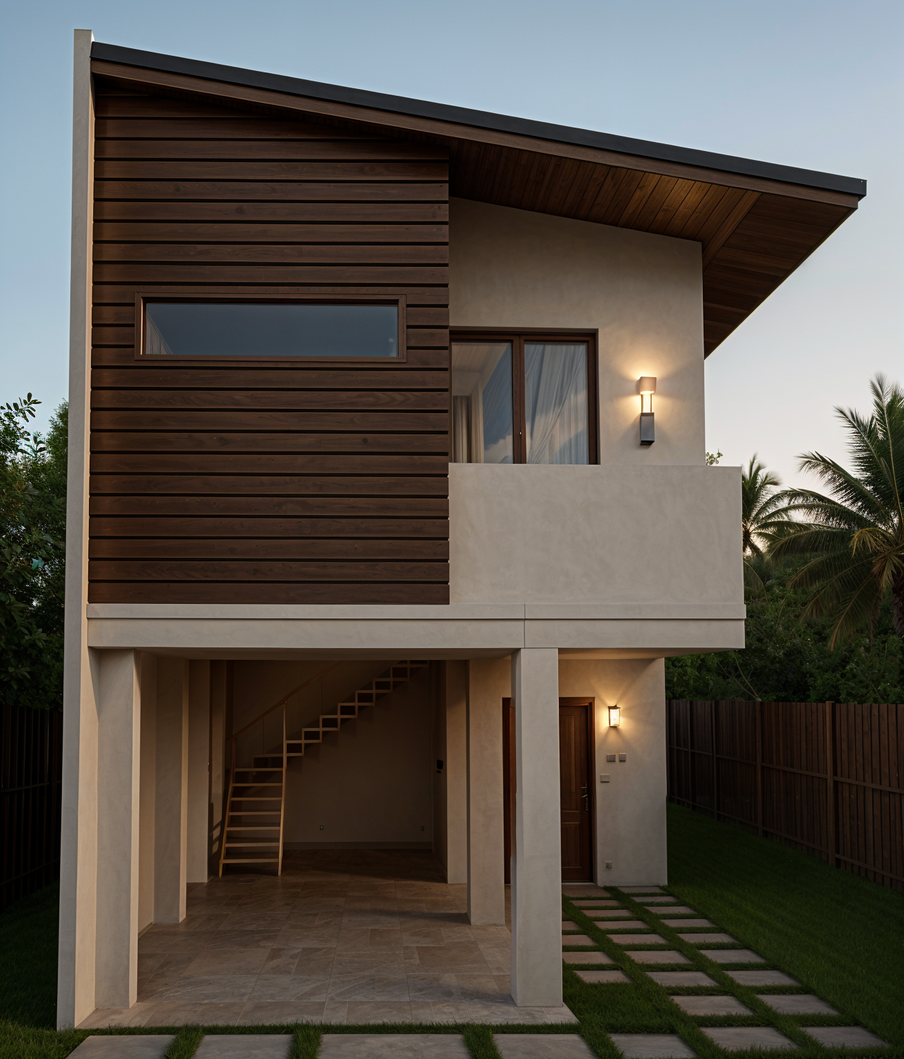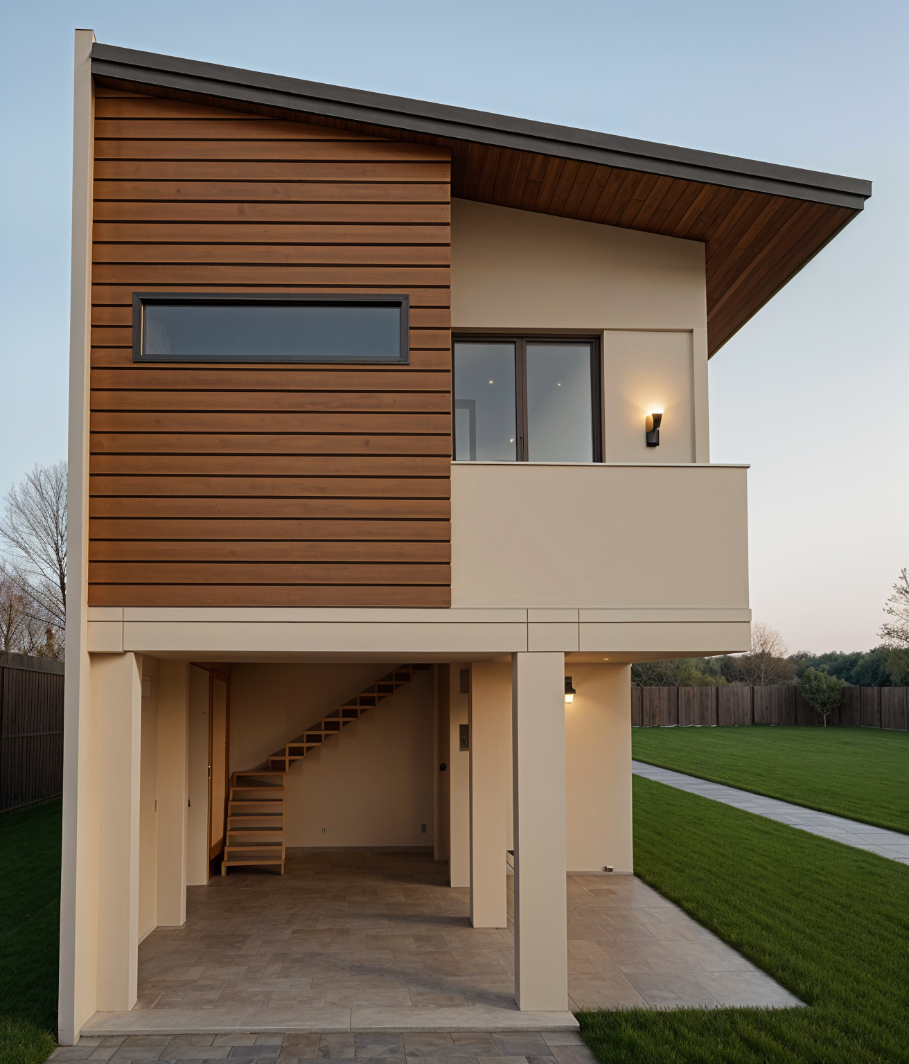modernist exterior shot terracotta brown horizontal cladding paint color for walls is yellow beige lighted wall lamp wood pvc ceiling architecture